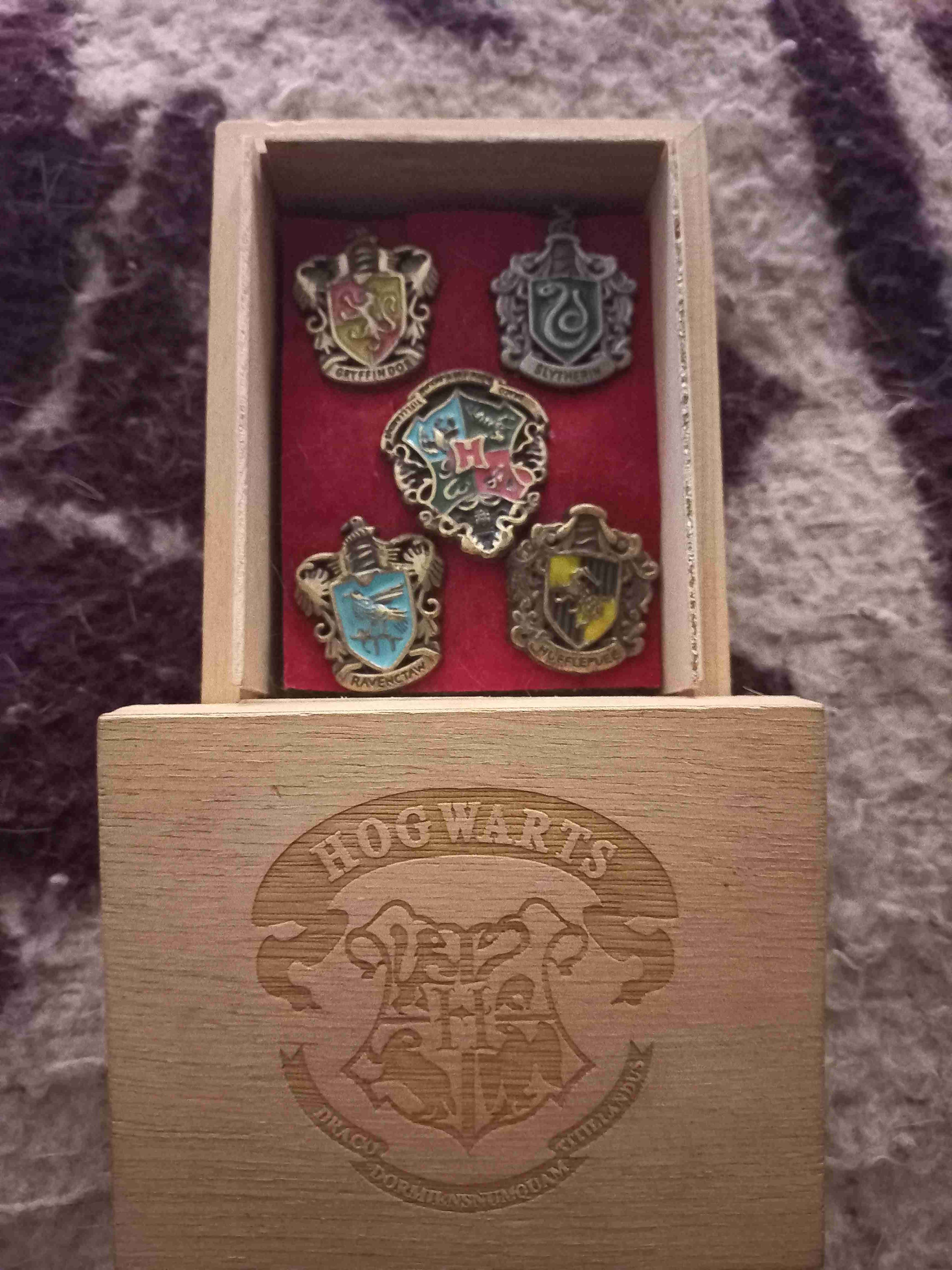 Conjunto de pines metalicos de las casas de Hogwarts en caja de madera. Ideal para fanáticos. Buen estado.