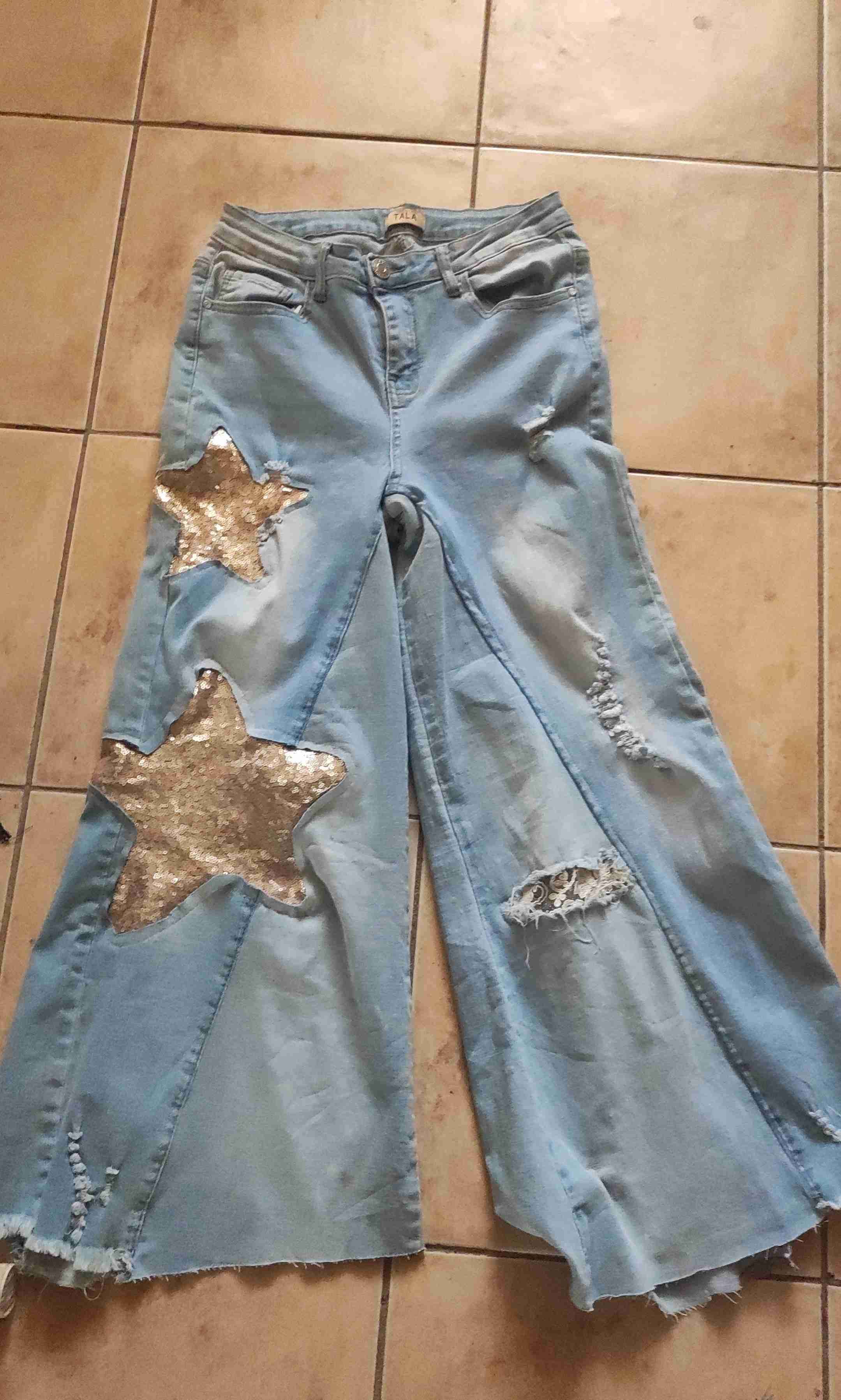 Jeans celestes con apliques de estrellas y diseño rasgado. Perfectos para un look casual y moderno.