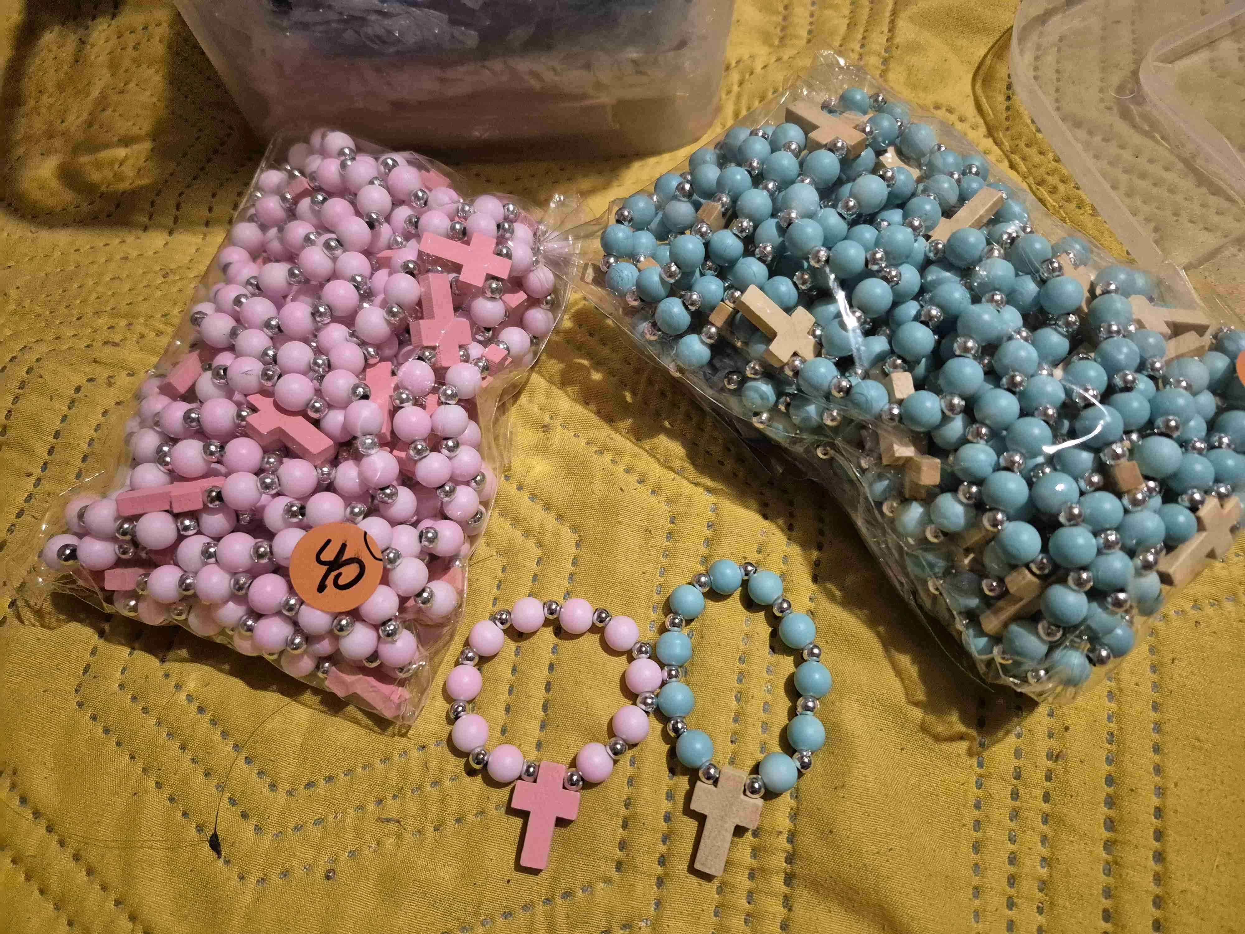 Rosarios en tonos rosado y celeste, ideales para recuerdos o regalos religiosos. En buen estado general.perlas de vidrio 40 de cada color 80 en total