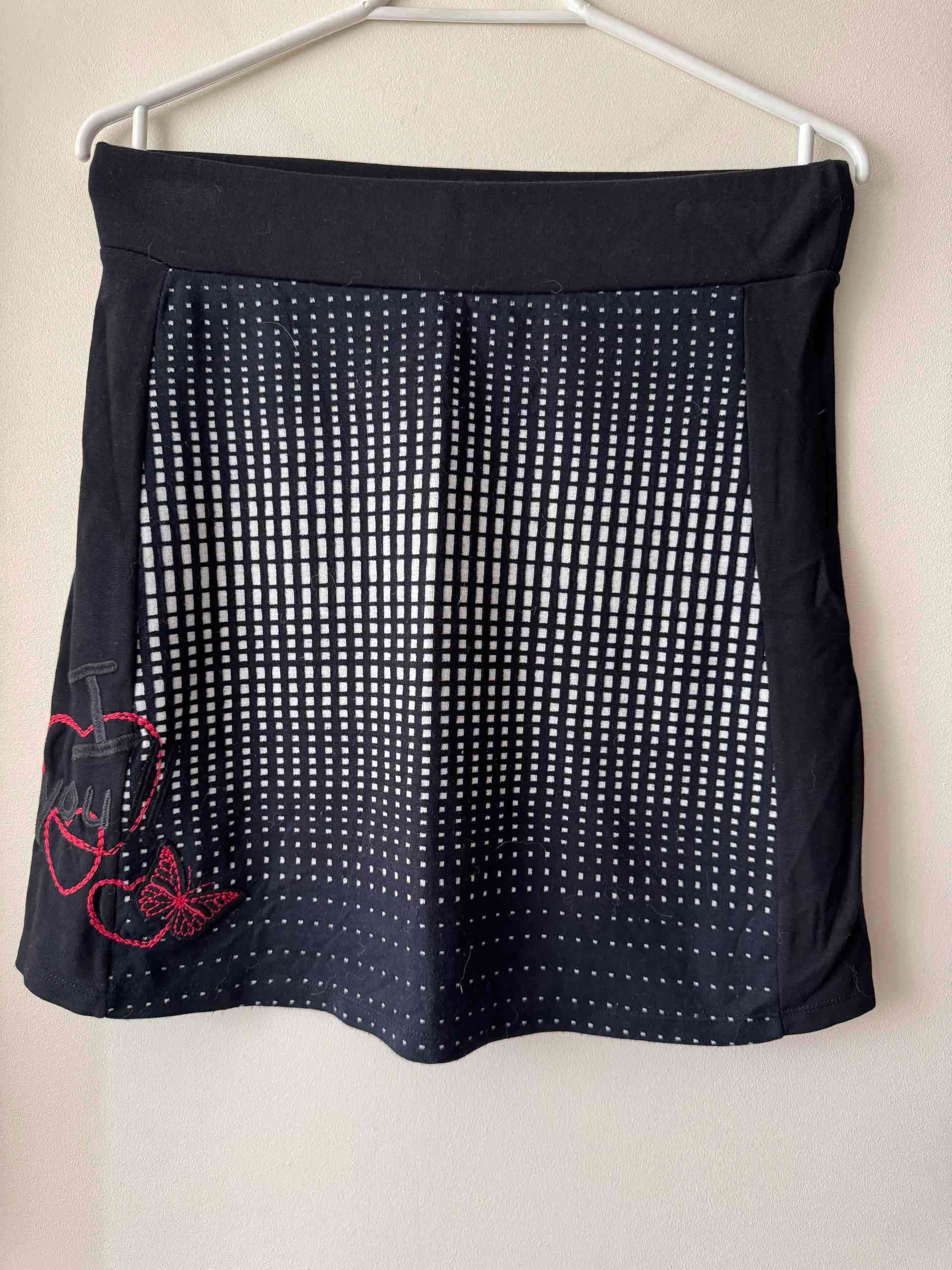 Falda negra con diseño de cuadros y detalles bordados, perfecta para uso casual. En buen estado general. Talla S.