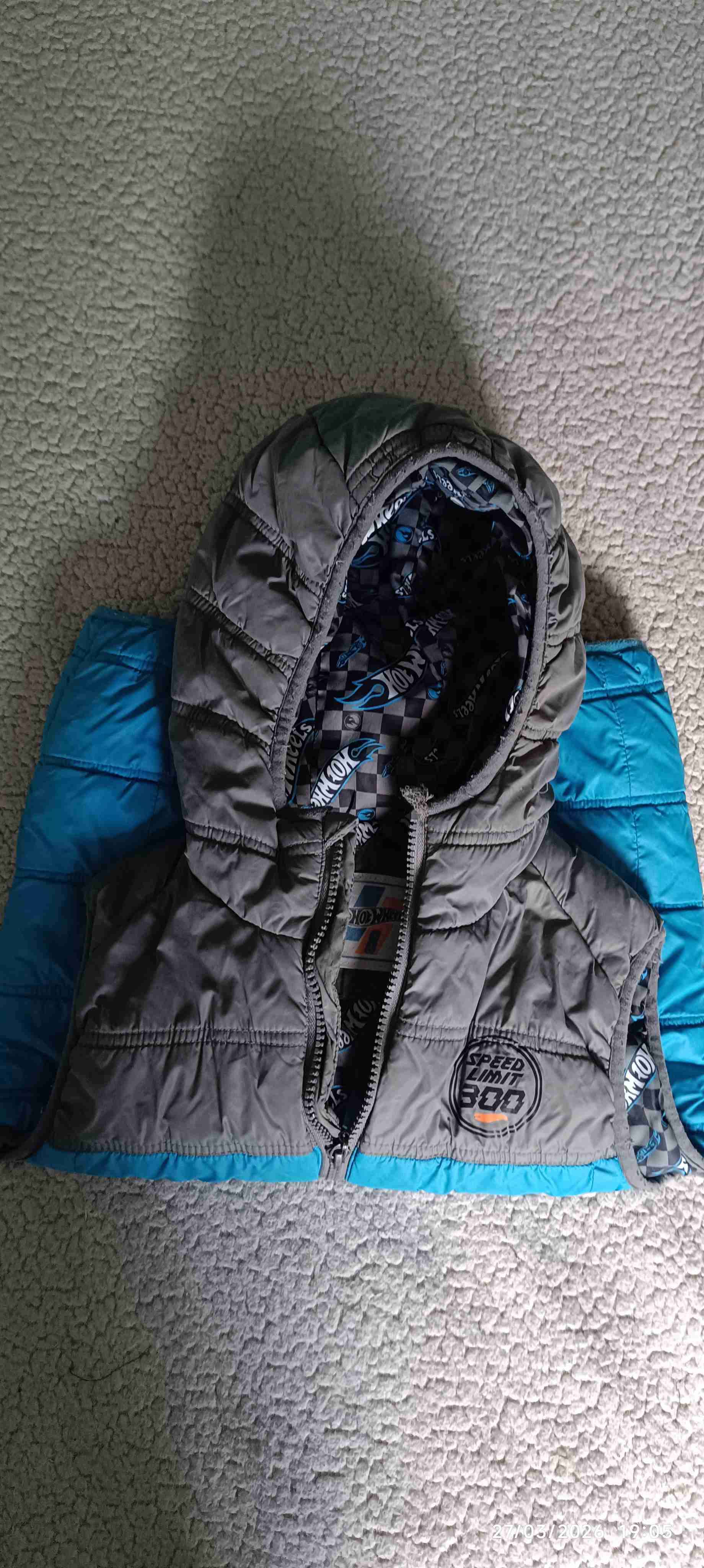 Chaleco acolchado gris y azul con capucha, ideal para mantener caliente a los niños. Diseño divertido y cómodo para el uso diario.