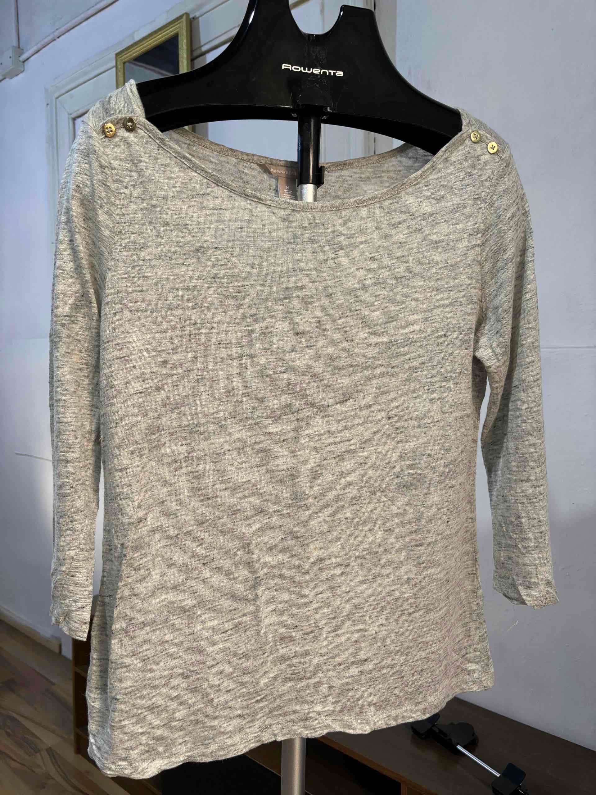Polera de manga larga gris con botones decorativos en los hombros. Ideal para uso diario.