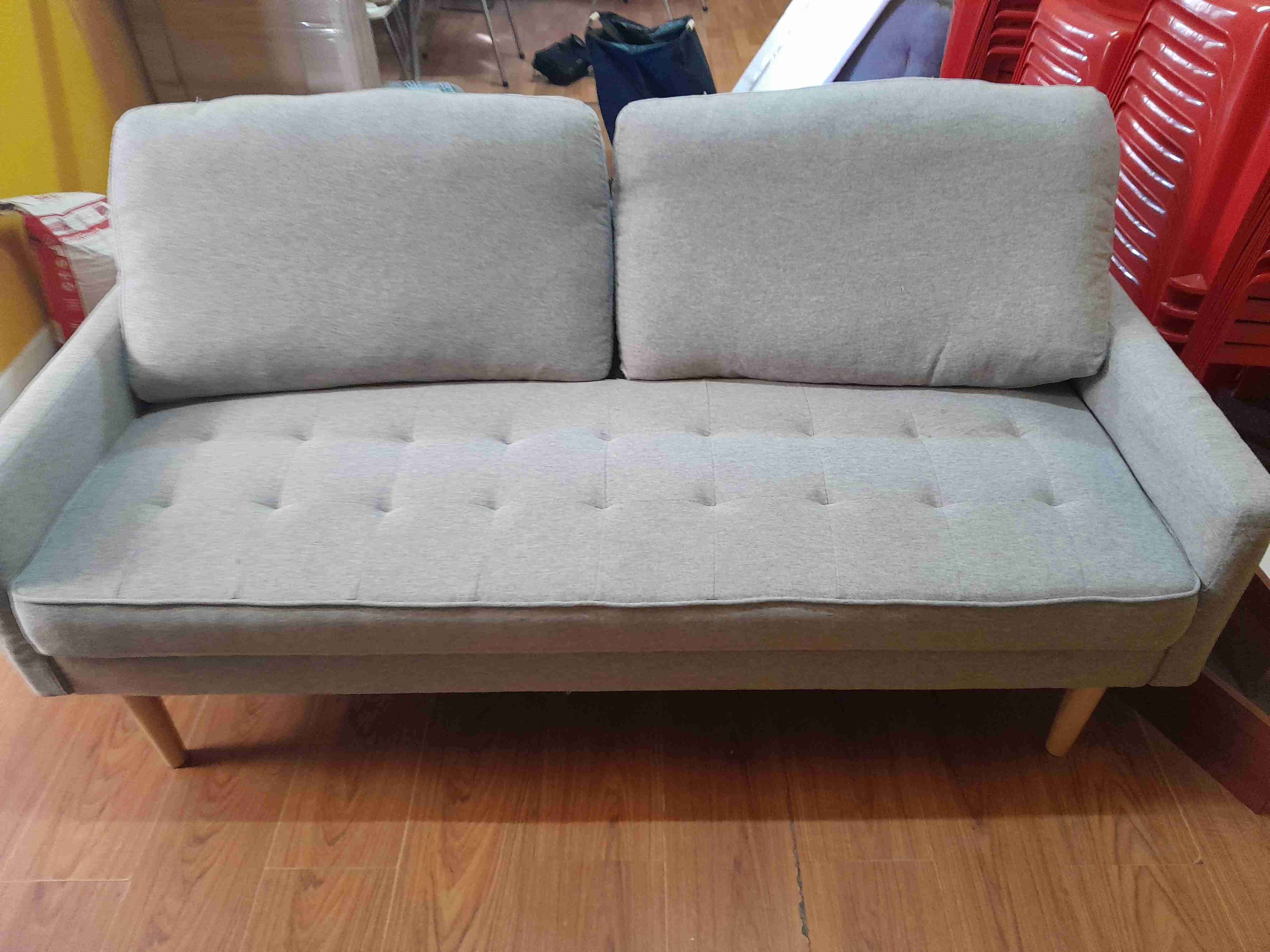 Elegante sofá gris, perfecto para sala de estar. En buen estado con patas de madera.