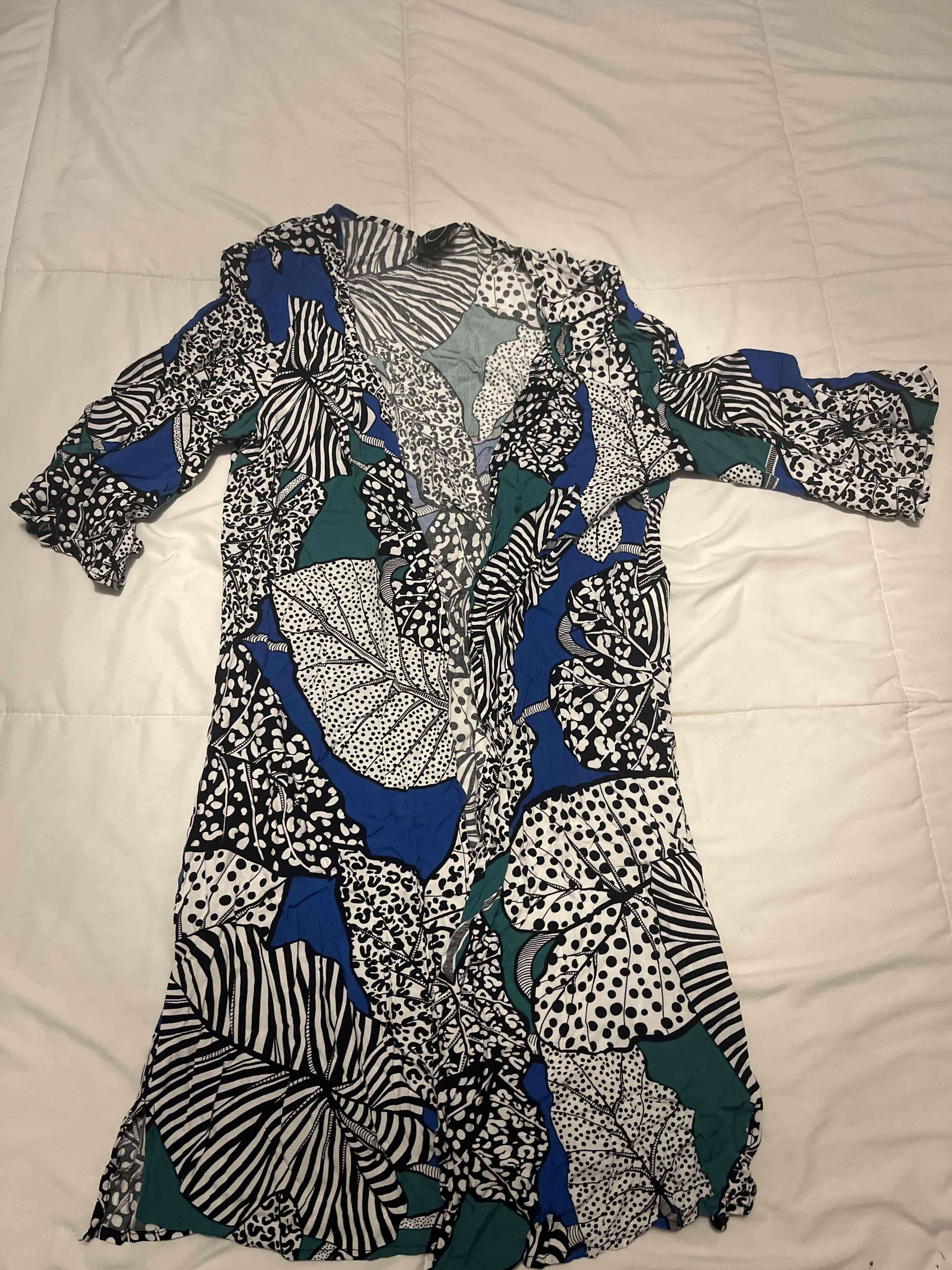 Tapado con estampado de hojas en tonos azules y negros. Ideal para verano, en buen estado con uso leve.