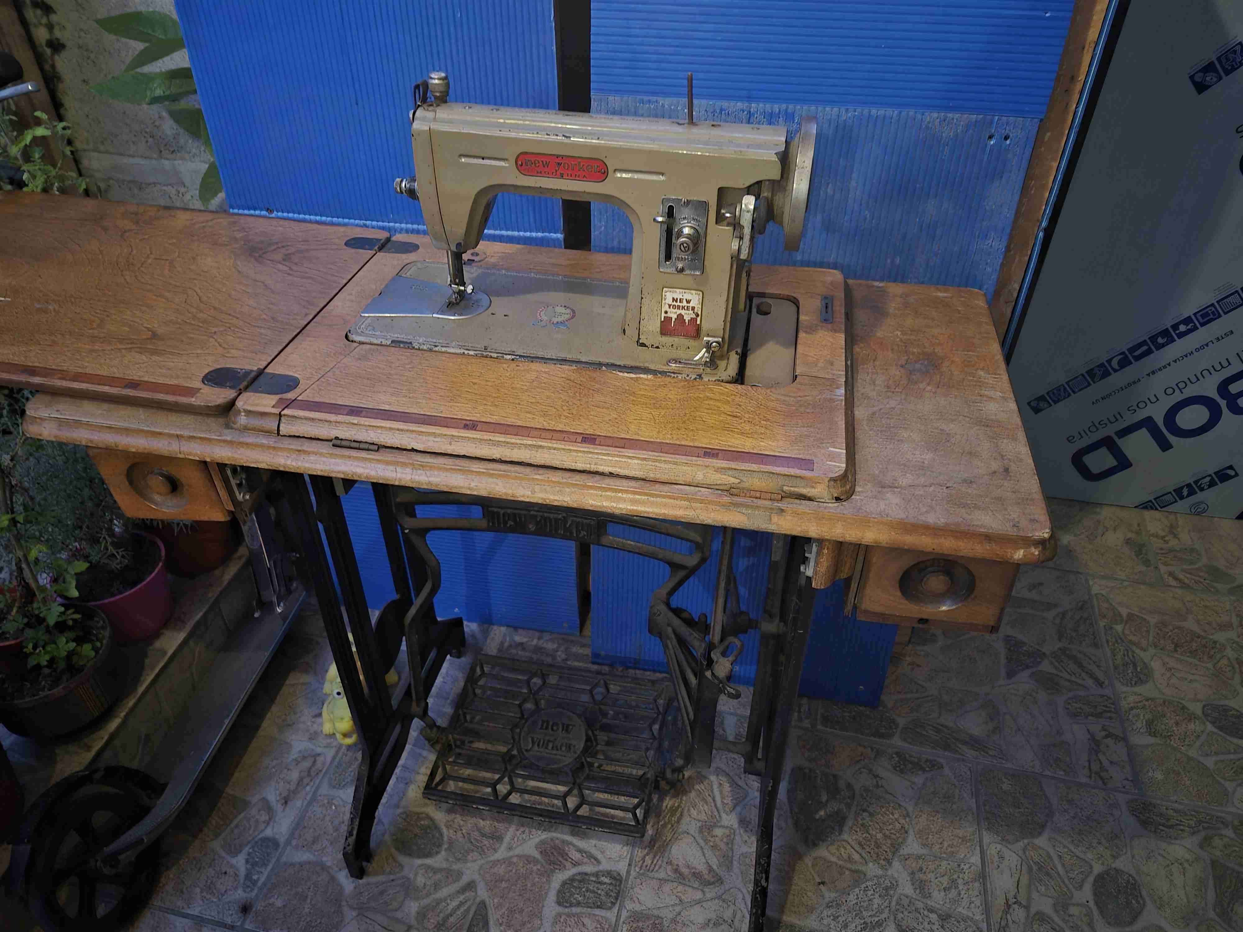 Máquina de coser antigua con mueble
