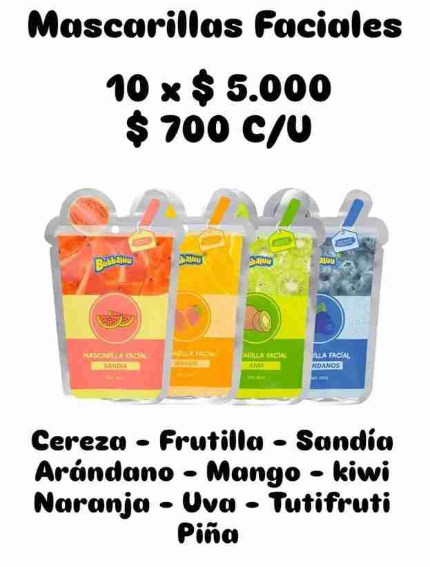 Paquete de mascarillas faciales de distintos sabores frutales. Ideal para refrescar y nutrir la piel.