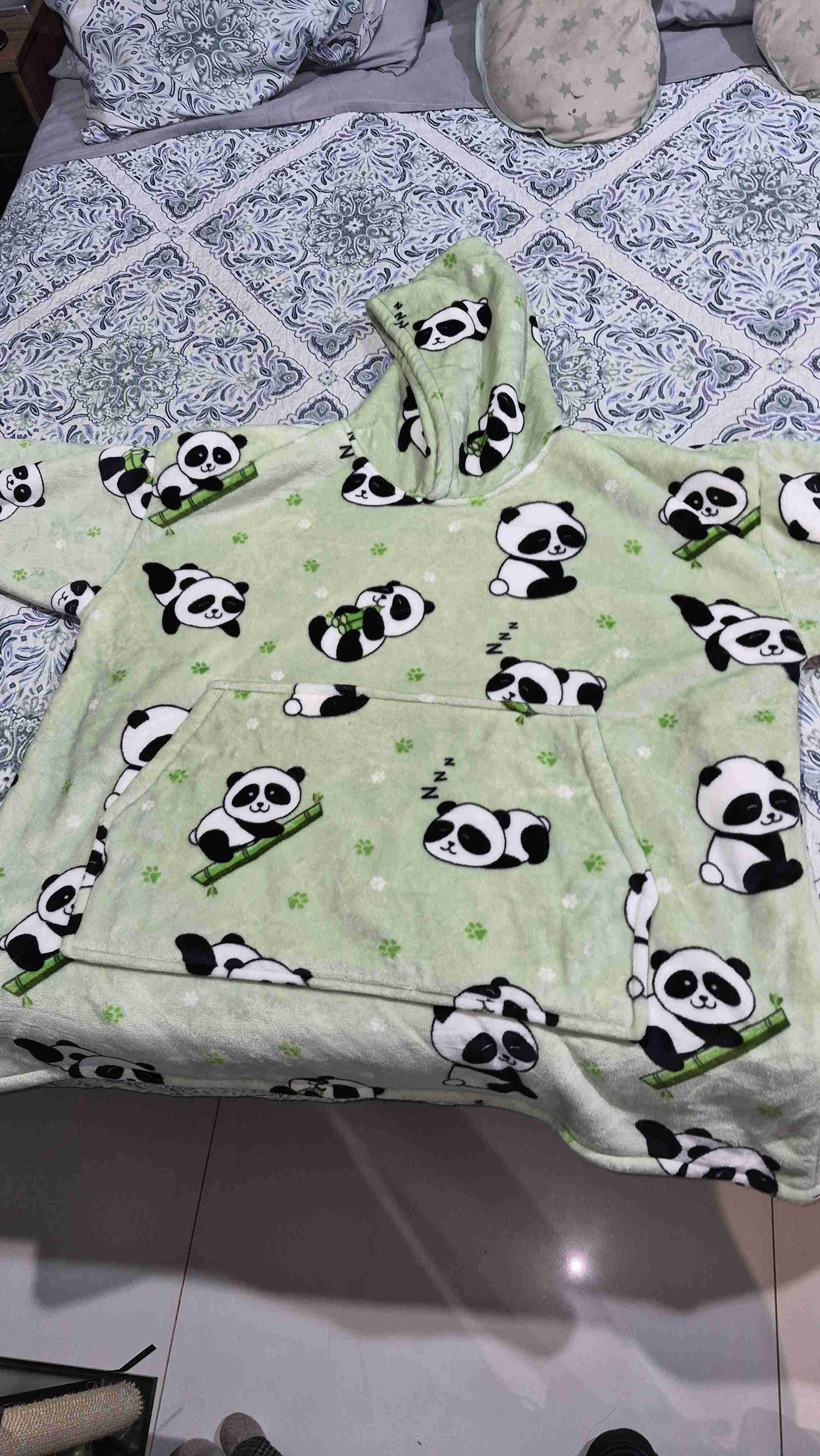 Cómodo polerón tipo manta de color verde con estampado de pandas. Ideal para días fríos en casa. Practicamente nuevo, solo me lo probé. Es mas grande que los que venden usualmente en tiendas, cama de dos plazas como referencia de tamaño.