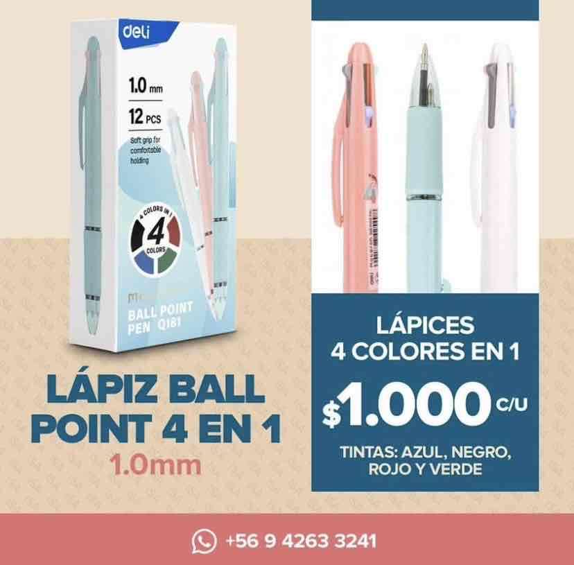 Lápiz ballpoint con 4 colores: azul, negro, rojo y verde. Ideal para estudiantes y oficina.