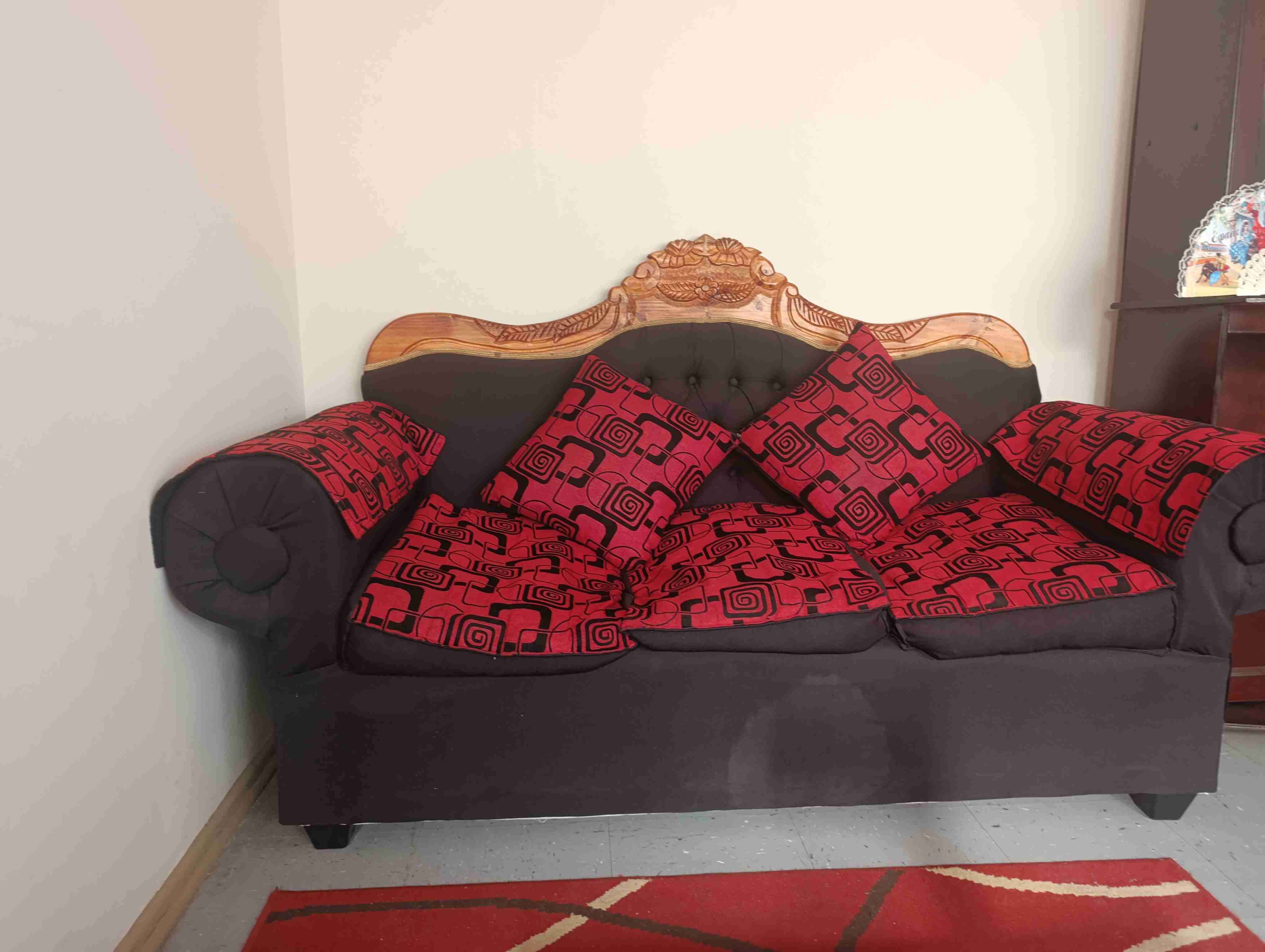 Elegante sofá de tres plazas con detalles en madera tallada y cojines rojos. Ideal para sala de estar.