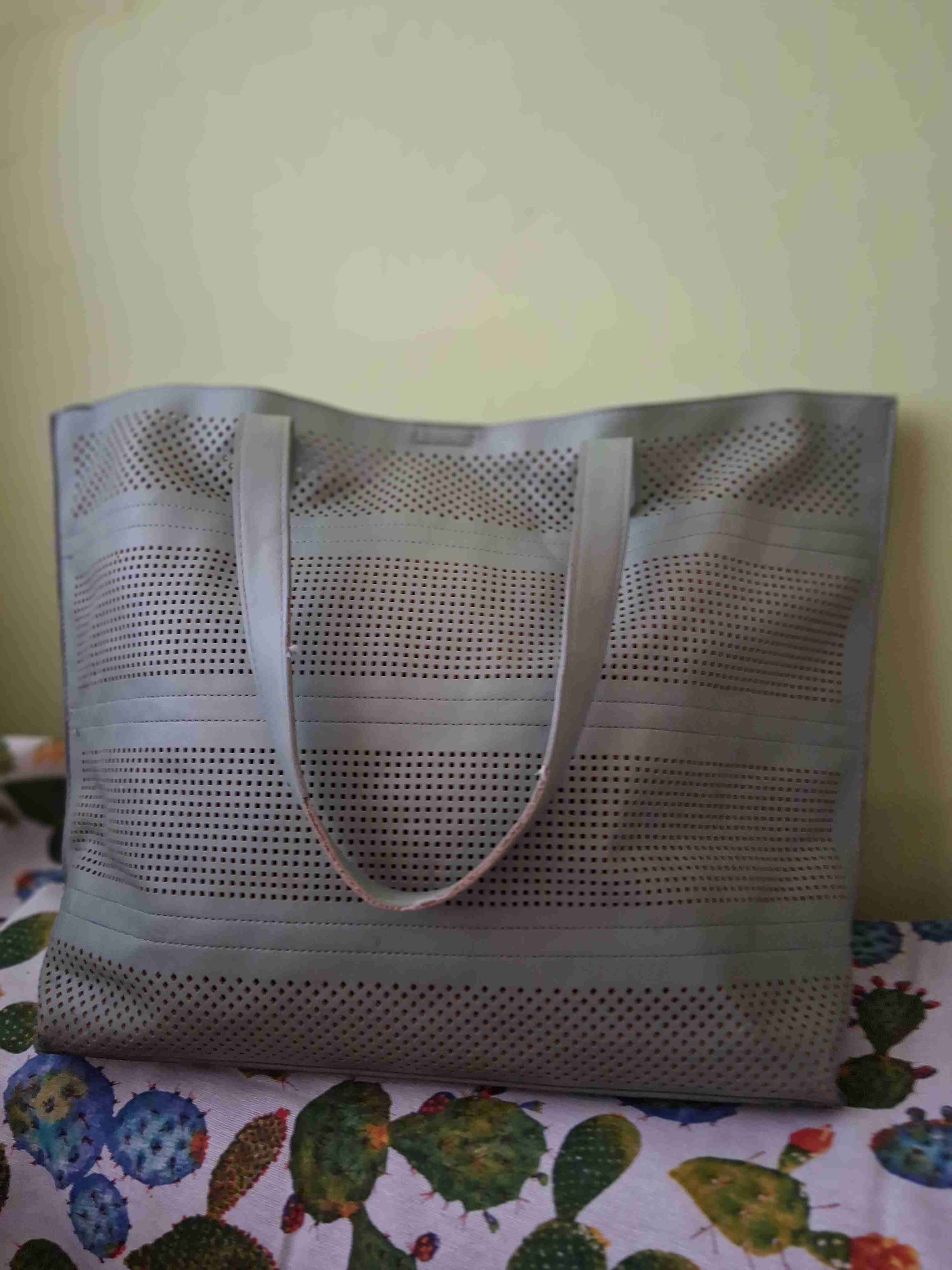 Elegante bolso tote gris con diseño perforado, perfecto para el uso diario. En buen estado.