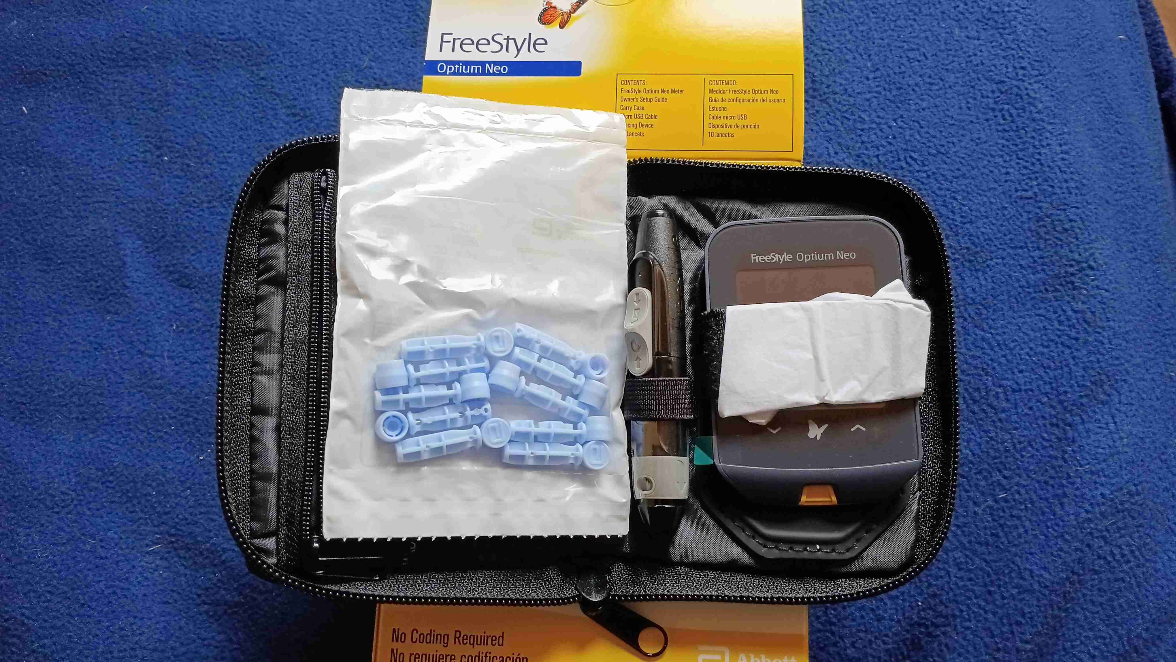 Monitor de glucosa en sangre en buen estado. Ideal para un control regular, incluye estuche y accesorios, viene con caja de lancetas y cintas