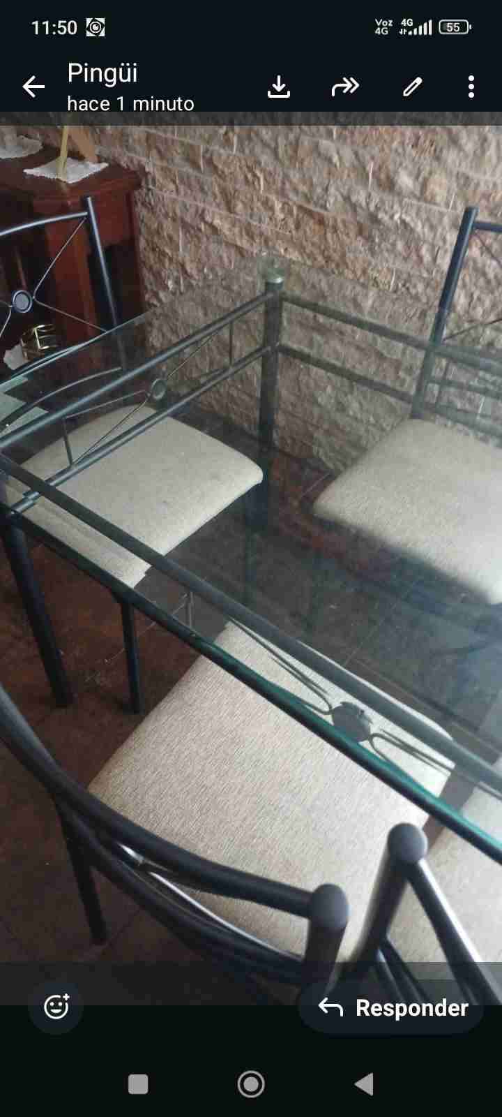 Elegante mesa de vidrio con estructura metálica y sillas acolchadas. Ideal para el comedor o terraza. Buen estado general.