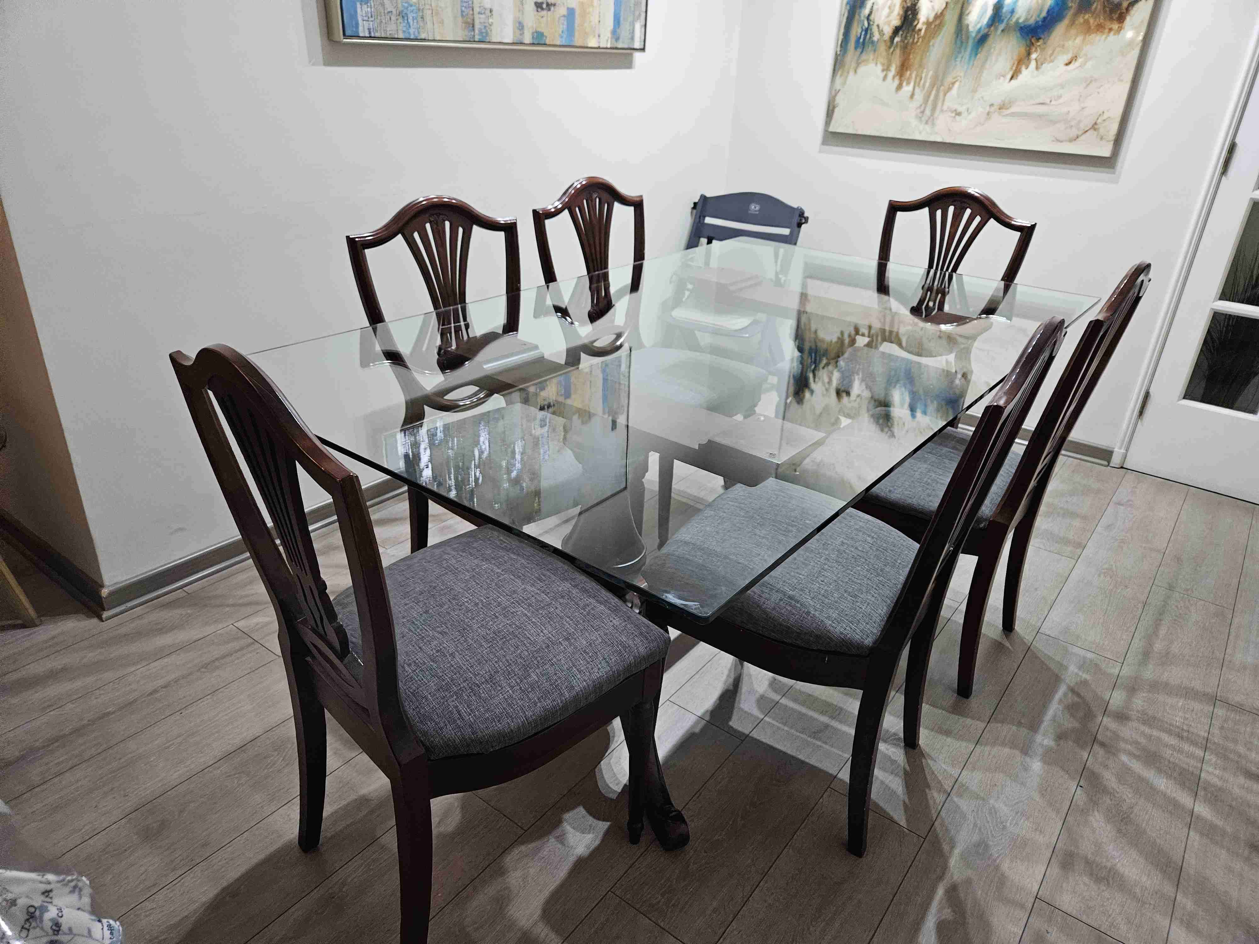 Elegante mesa de comedor con cubierta de vidrio y base de madera. Perfecta para reuniones familiares. Buen estado general. Solo detalle en vidrio.