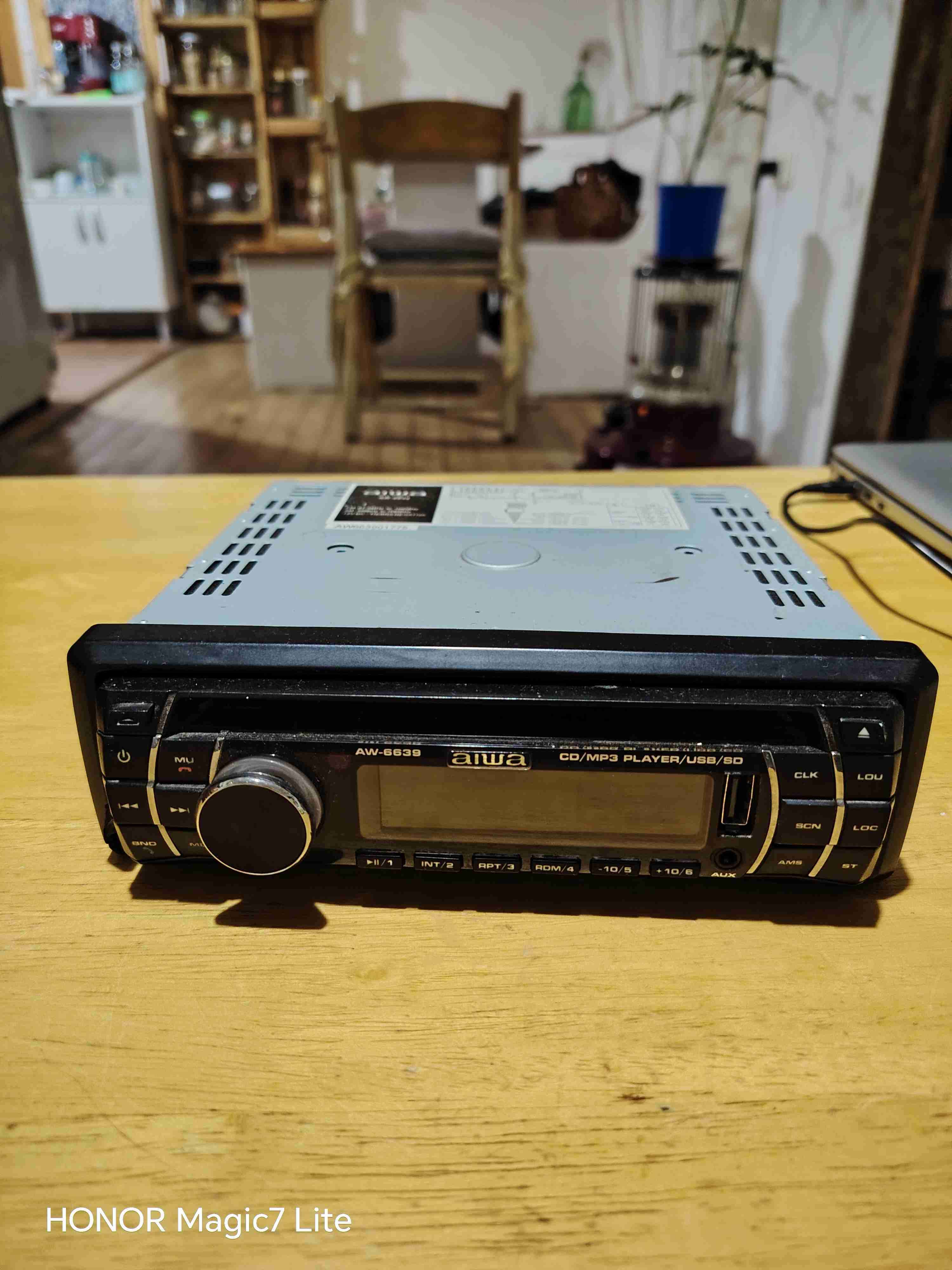 Reproductor de auto Aiwa, ideal para disfrutar música en CD o MP3. Incluye puerto USB y SD en buen estado. No incluye conectores ni control remoto.