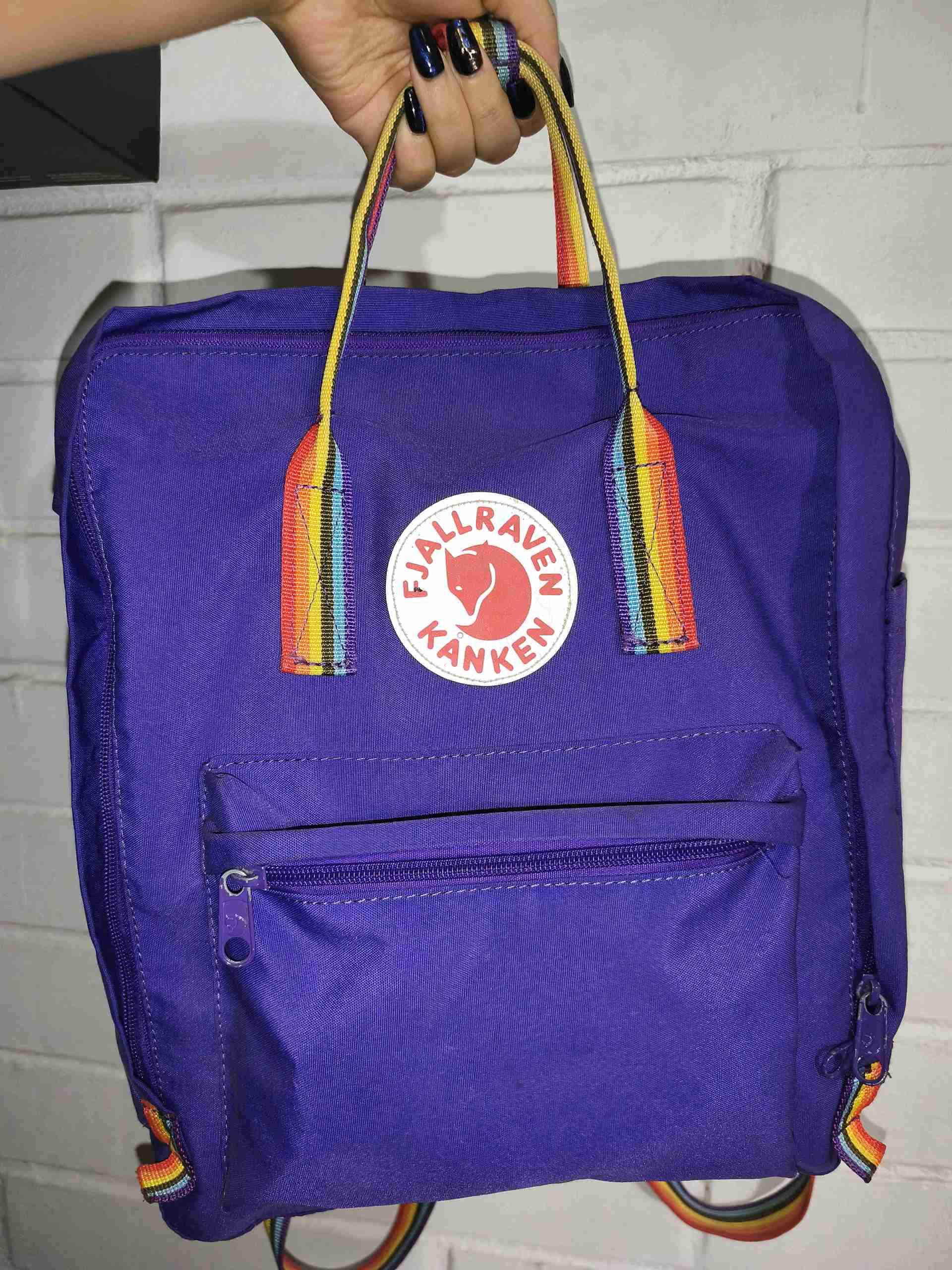 Mochila morada con detalles arcoíris, perfecta para uso diario. En buen estado general, solo con desgaste en el color de los cierres.