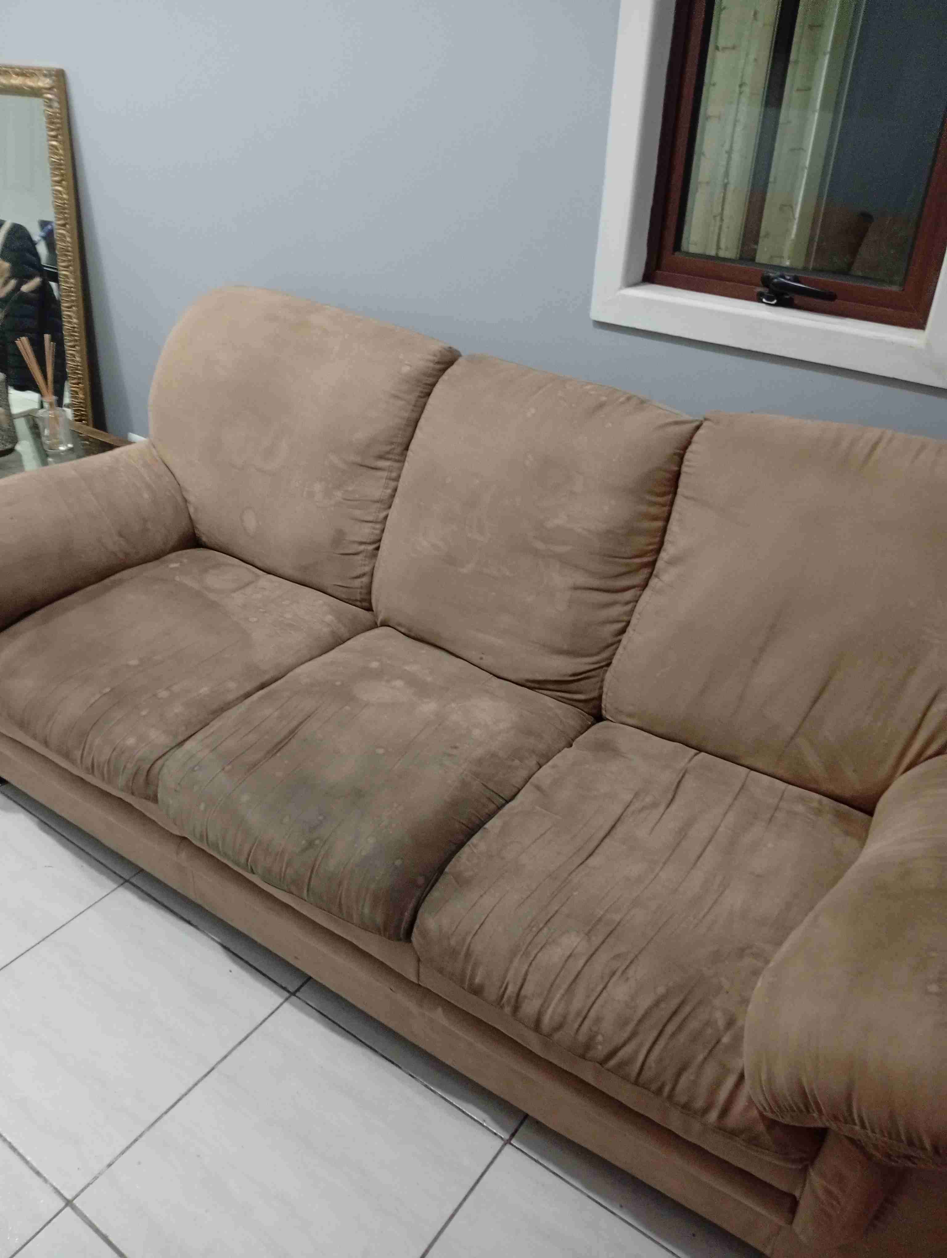 Sofá amplio y cómodo, ideal para sala de estar. Sillón para tapizar, tela manchada por uso Largo: 200cm Fondo: 96cm Altura: 90cm