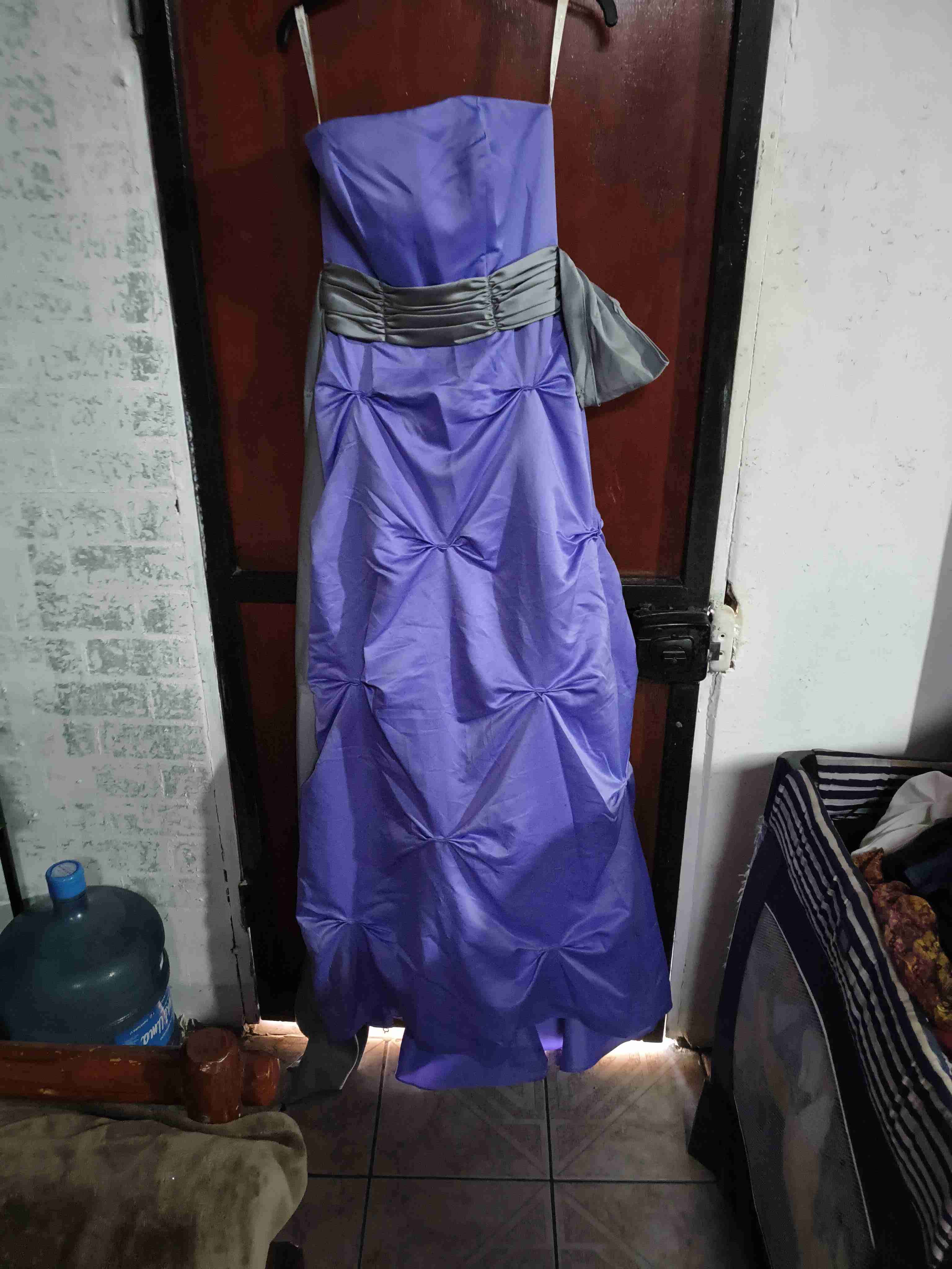 Elegante vestido de fiesta largo en color morado con detalles en gris. Ideal para eventos formales. En buen estado.