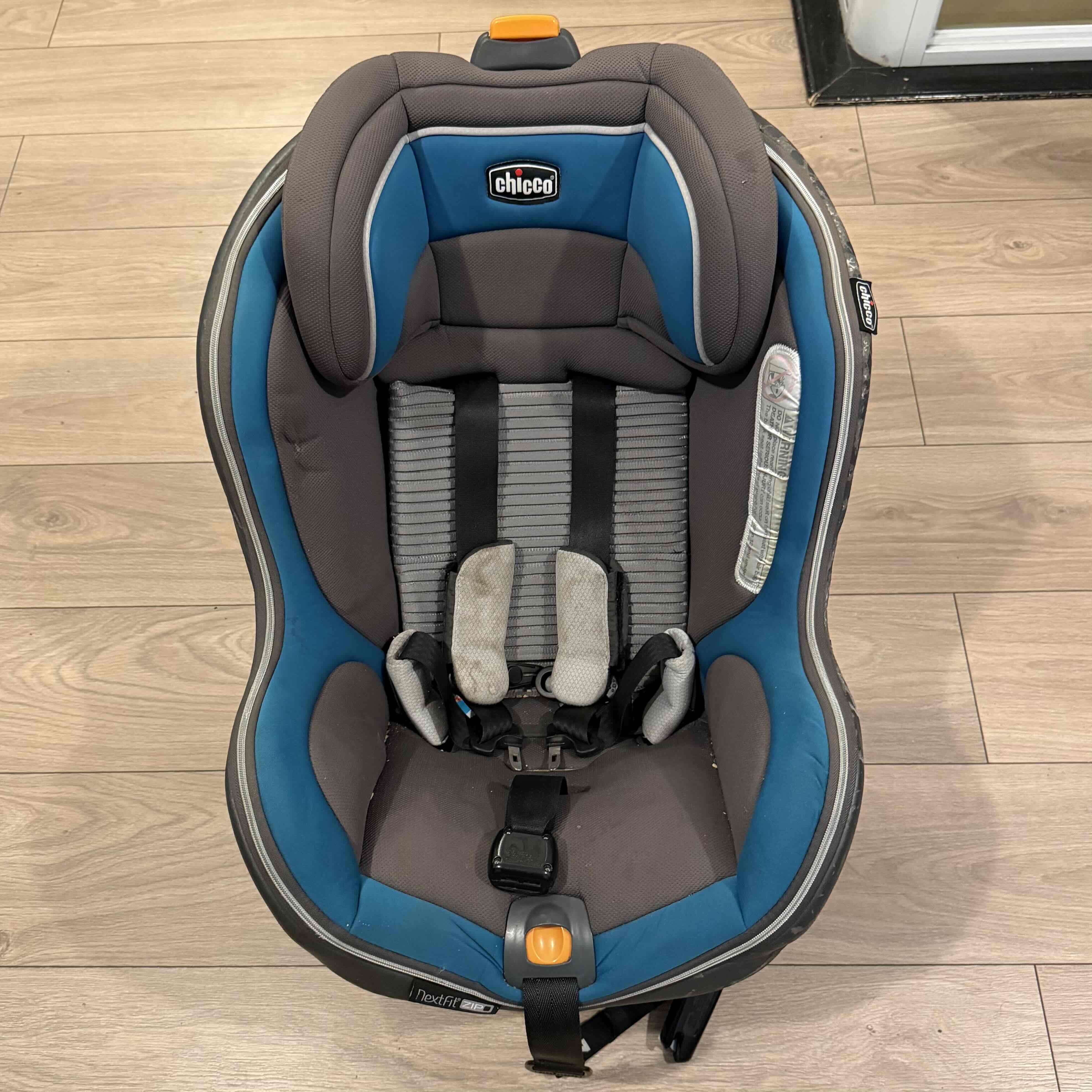 Silla de auto para niños Chicco en buen estado. Color gris y azul, ideal para seguridad infantil en viajes.