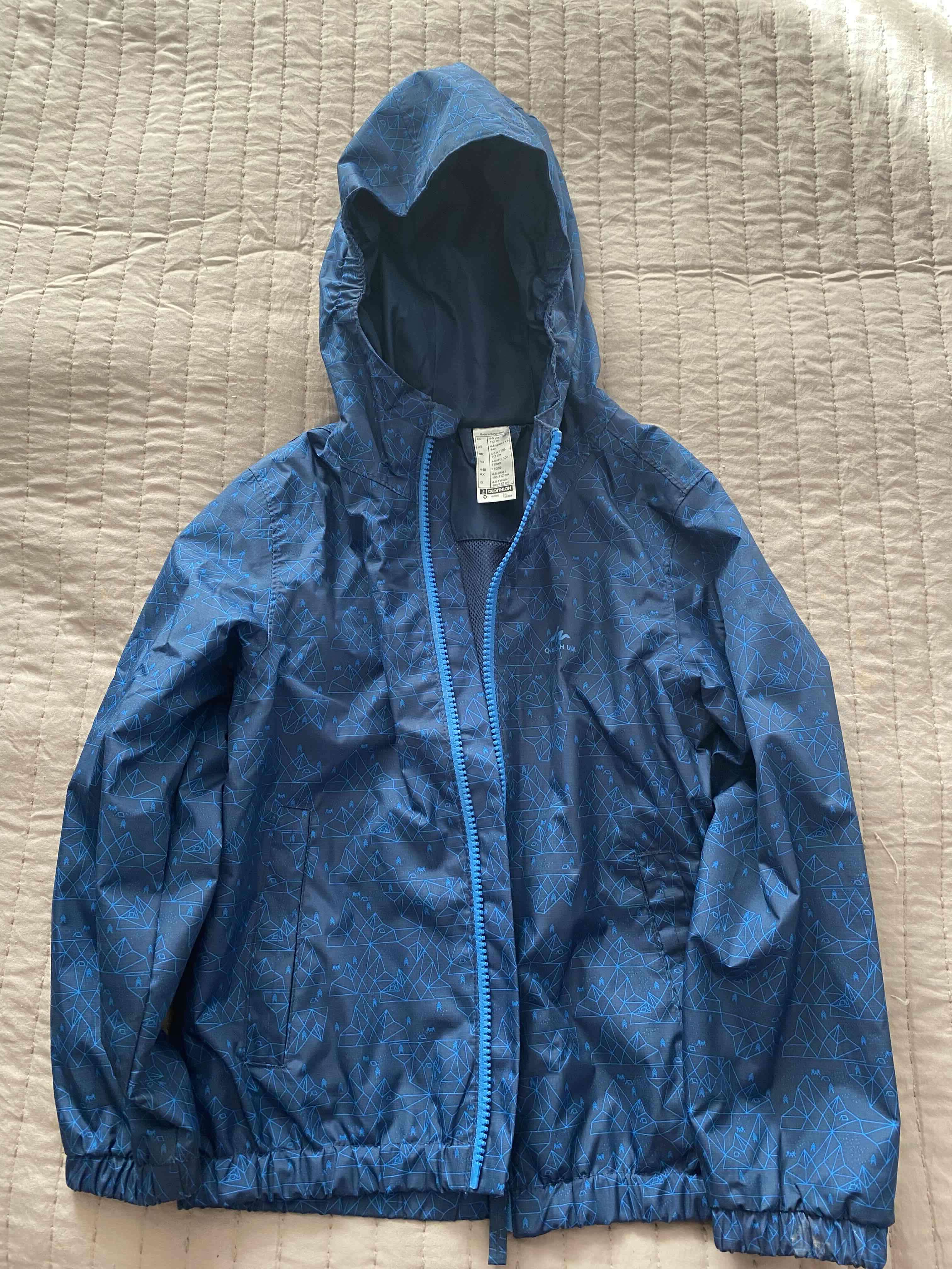 Chaqueta para niño en buen estado, ideal para días lluviosos. Diseño azul con patrones gráficos.