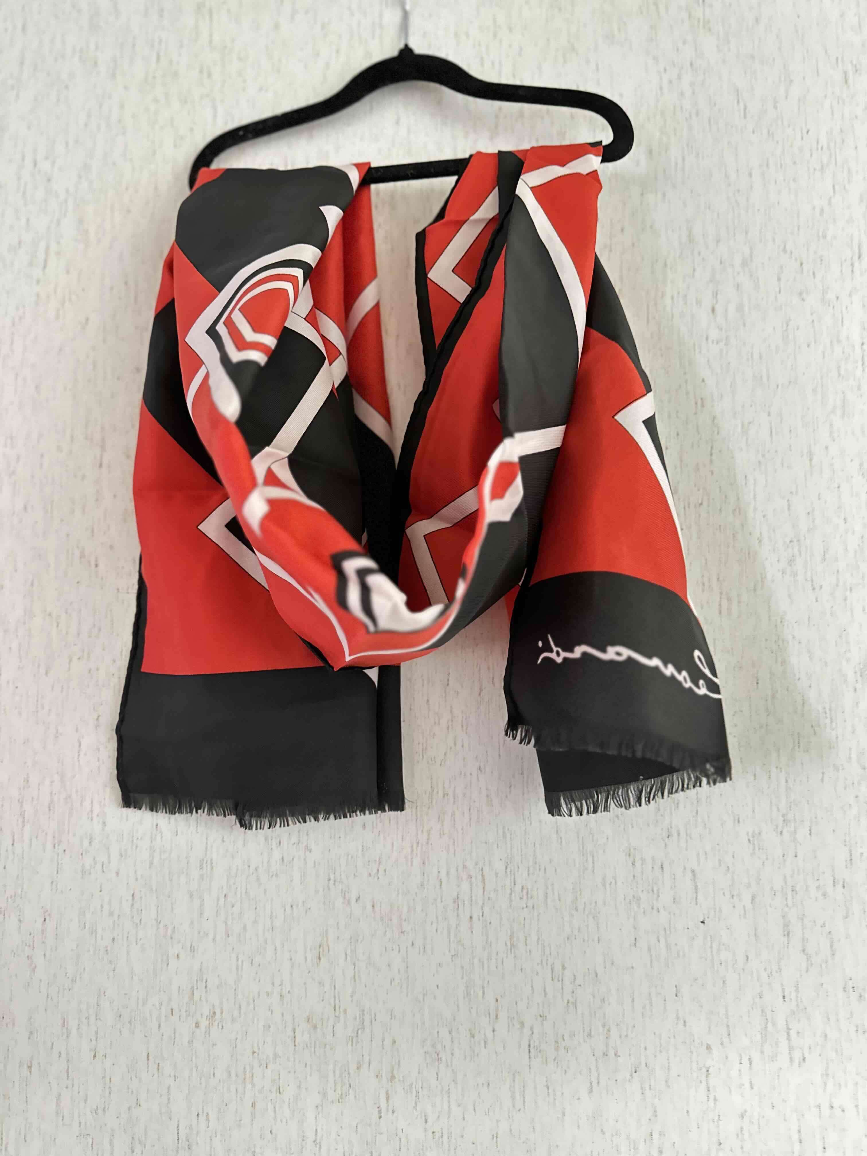 Bufanda de tela con diseño geométrico en rojo y negro. Ideal para un look casual o elegante. Buen estado general.