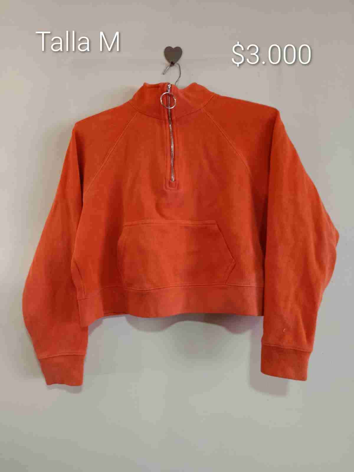 Polerón de mujer en tono anaranjado, con cierre delantero y bolsillo canguro. En buen estado, ideal para días frescos. Es corto