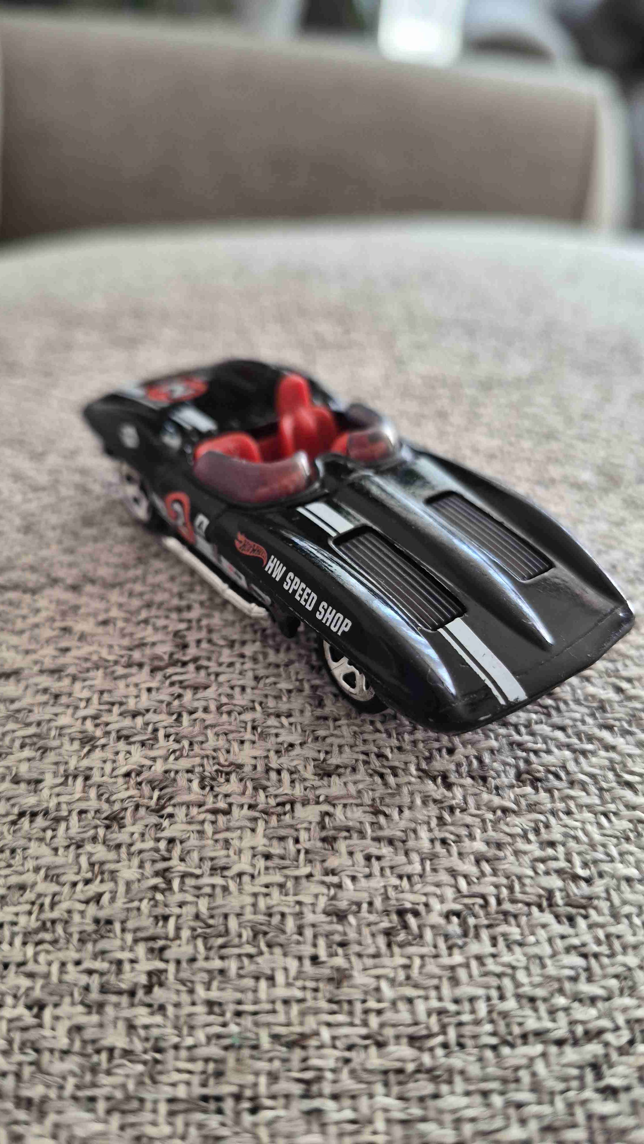 Auto de juguete negro con detalles rojos, ideal para coleccionar o jugar. En buen estado.