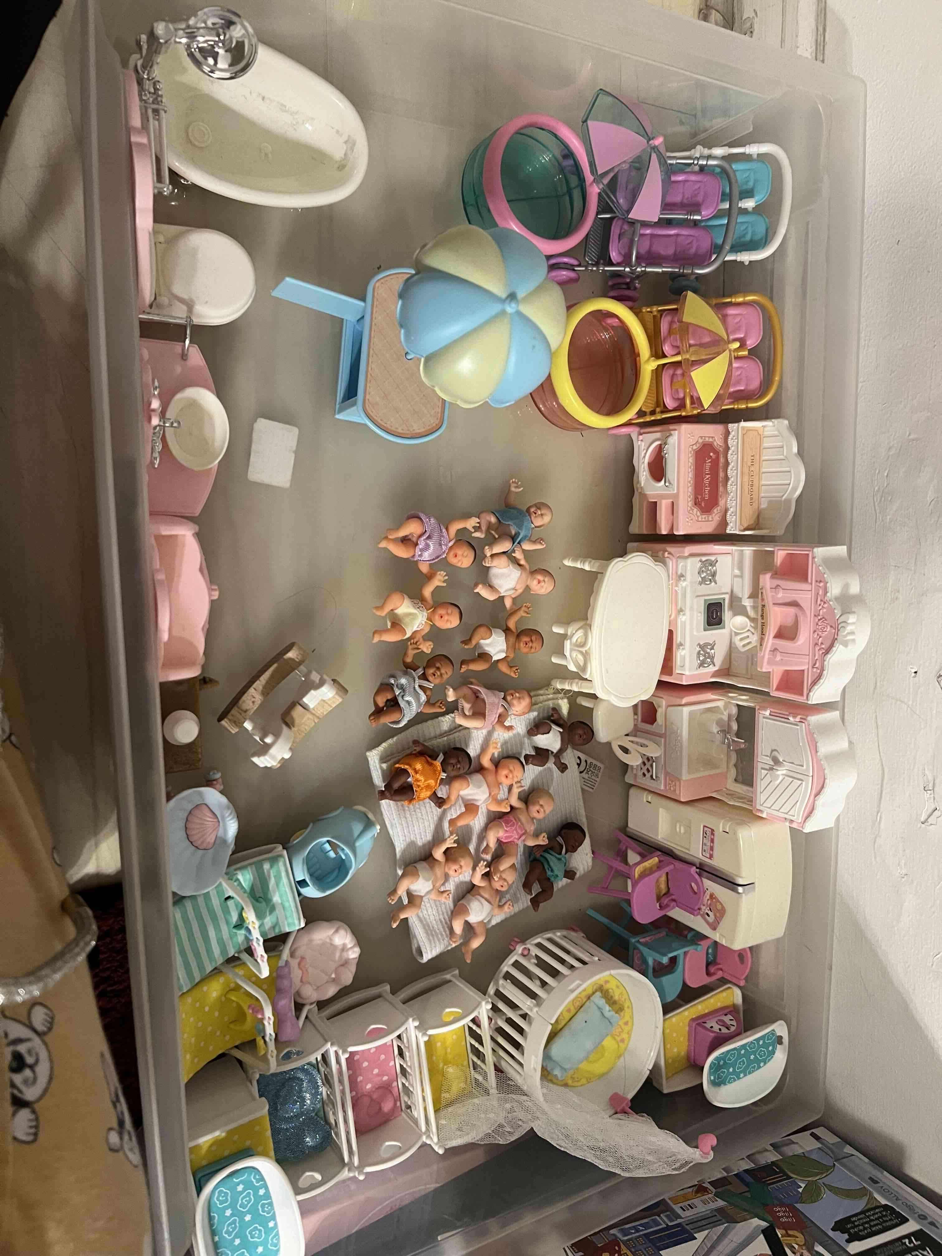 Conjunto de juguetes miniatura ideal para juegos de casita. Incluye muebles y figuras pequeñas.