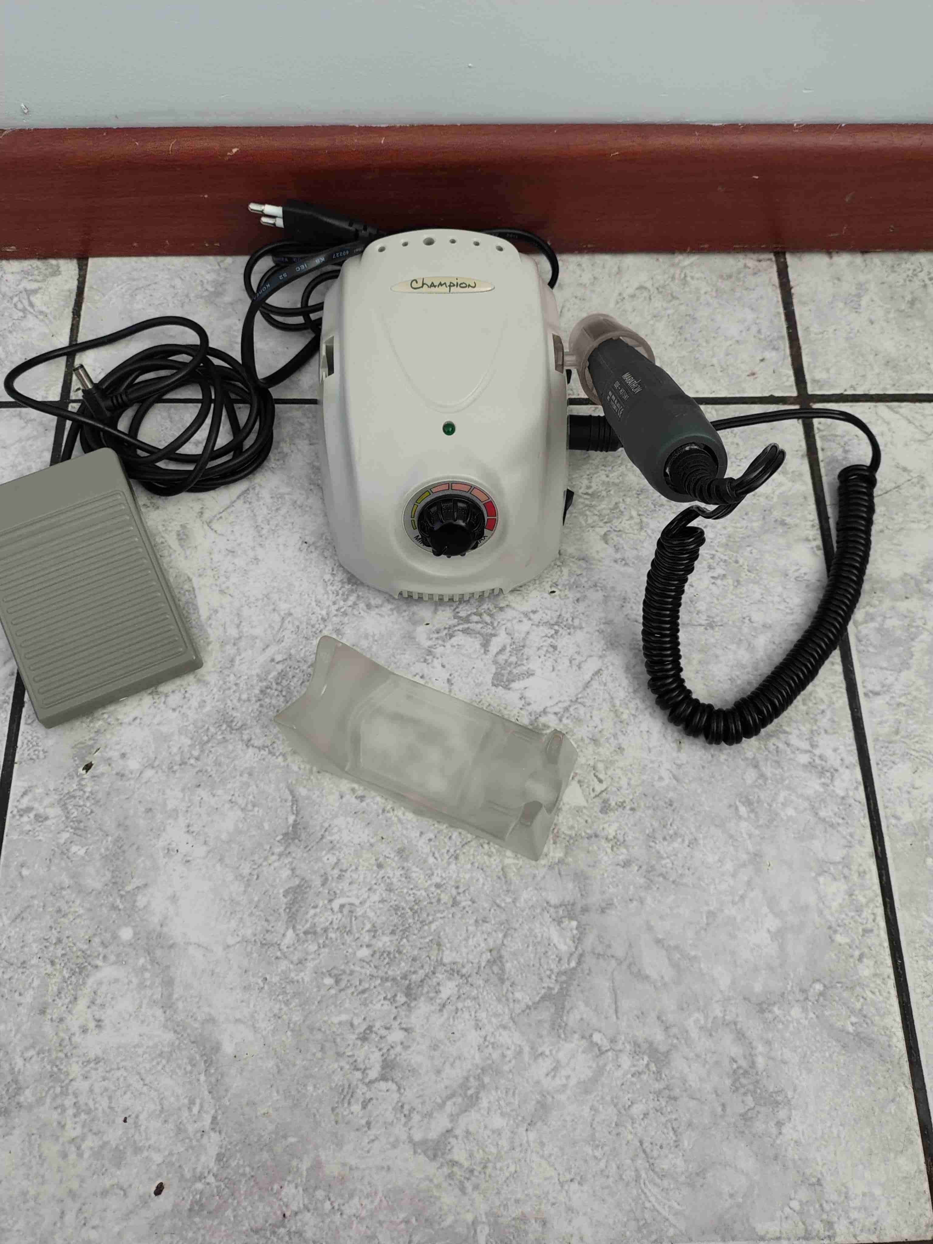 Torno eléctrico para manicura, ideal para uso profesional o personal. En buen estado, incluye pedal y soporte.
