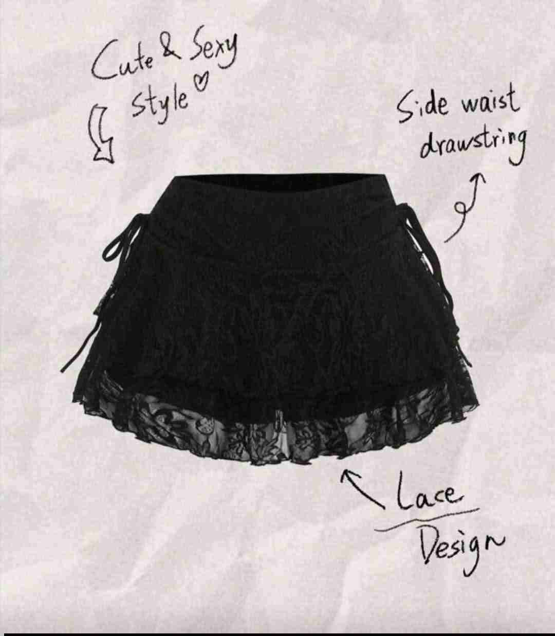 Mini falda negra de estilo sexy con diseño de encaje y ajuste lateral. Perfecta para una salida nocturna. Talla M