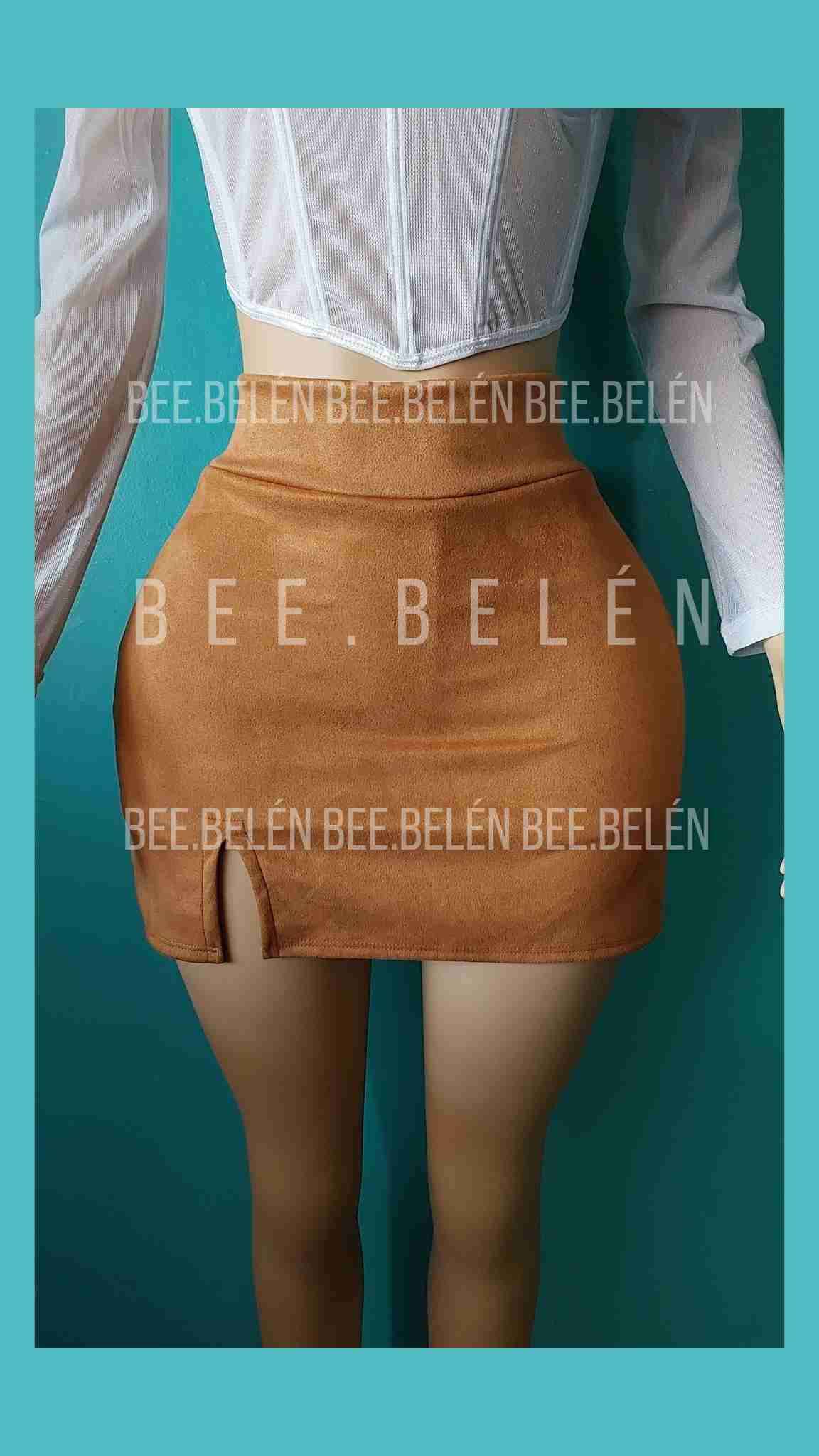 Mini falda short en tono camel con corte ajustado y detalle de abertura. Perfecta para salidas casuales. Nuevo, talla sm y lxl