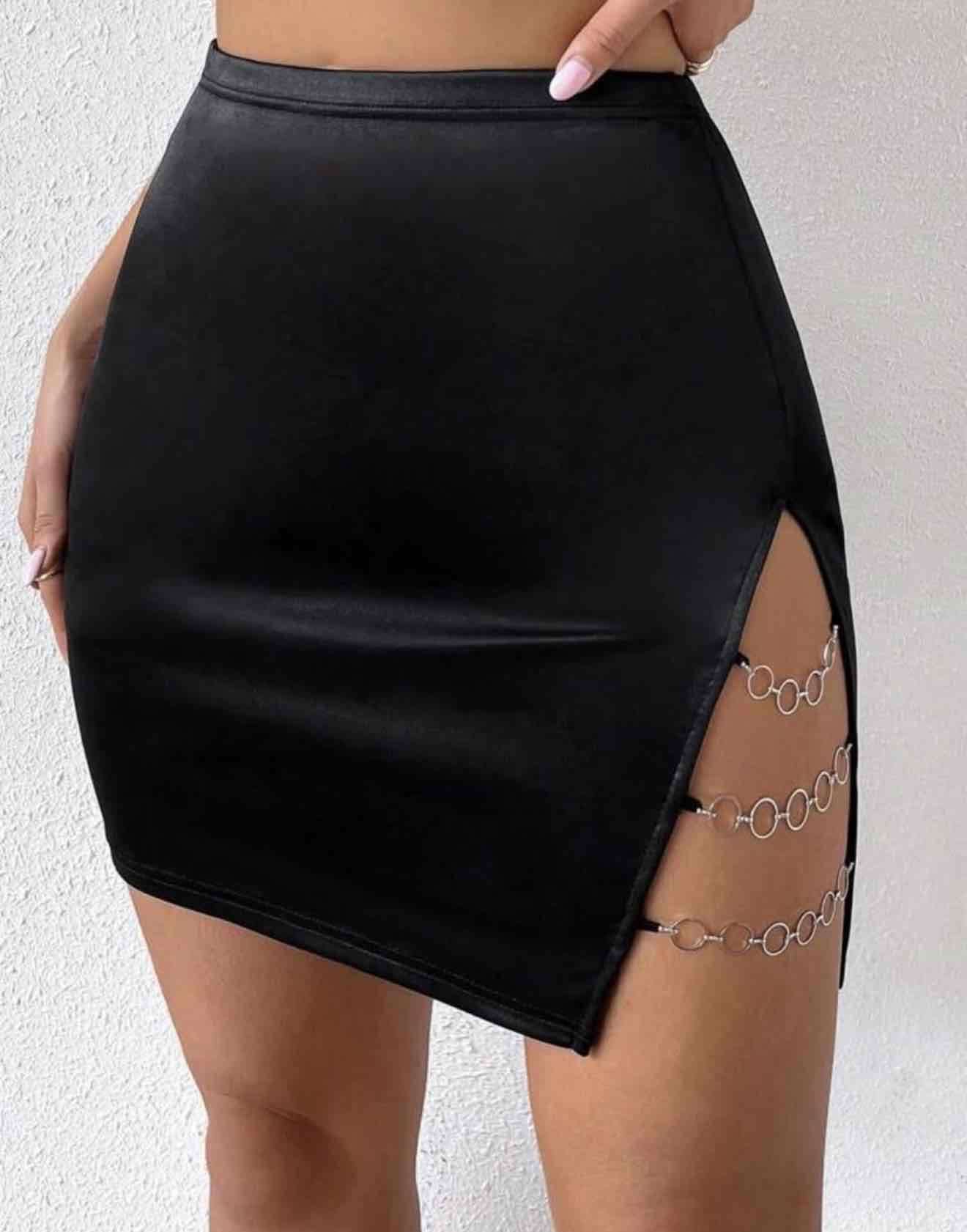 Elegante minifalda negra con detalle de cadenas en el costado. Ideal para salidas nocturnas.