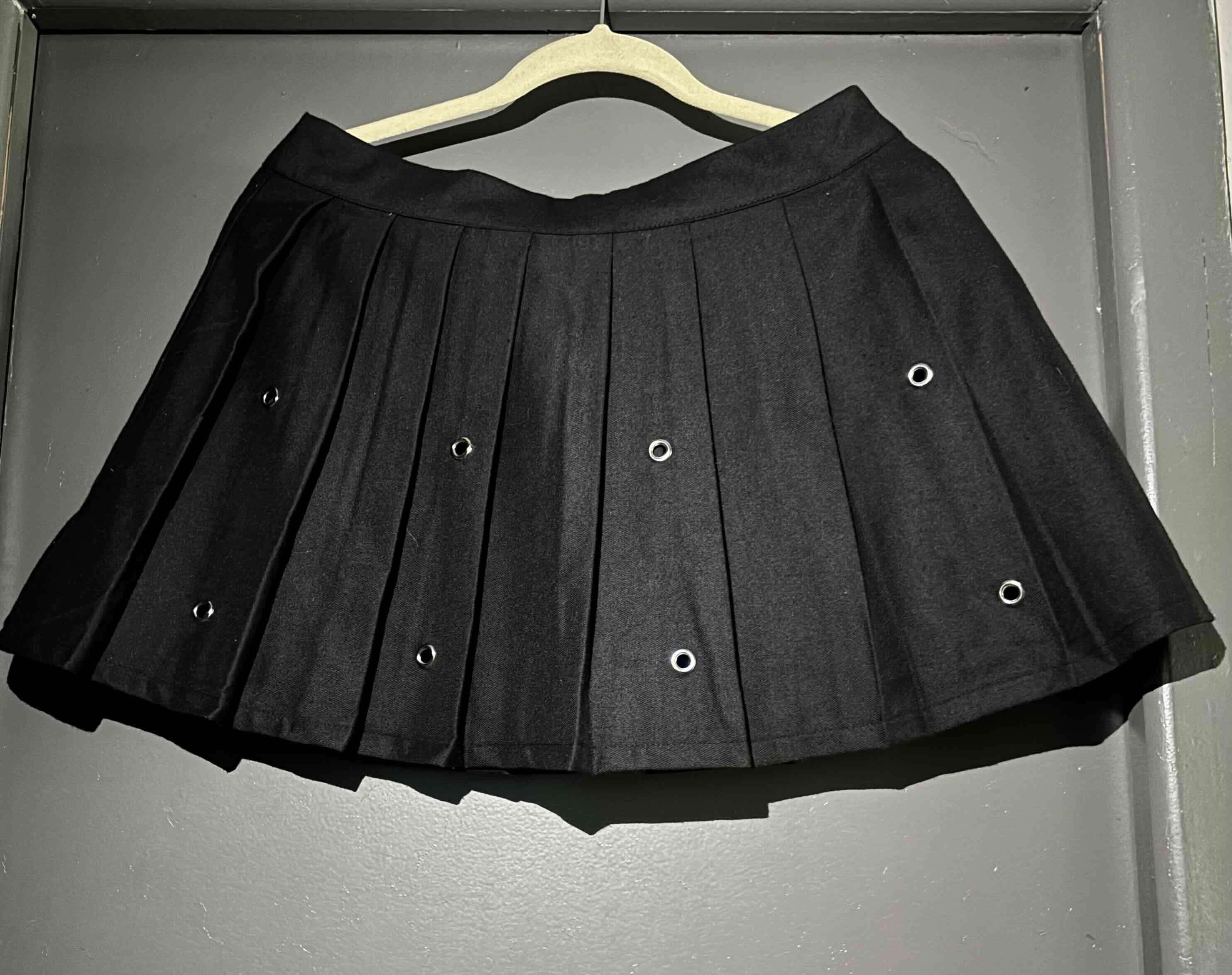 Minifalda negra plisada con detalles de ojetillos metálicos. Ideal para un look casual o alternativo. Buen estado general.Talla M