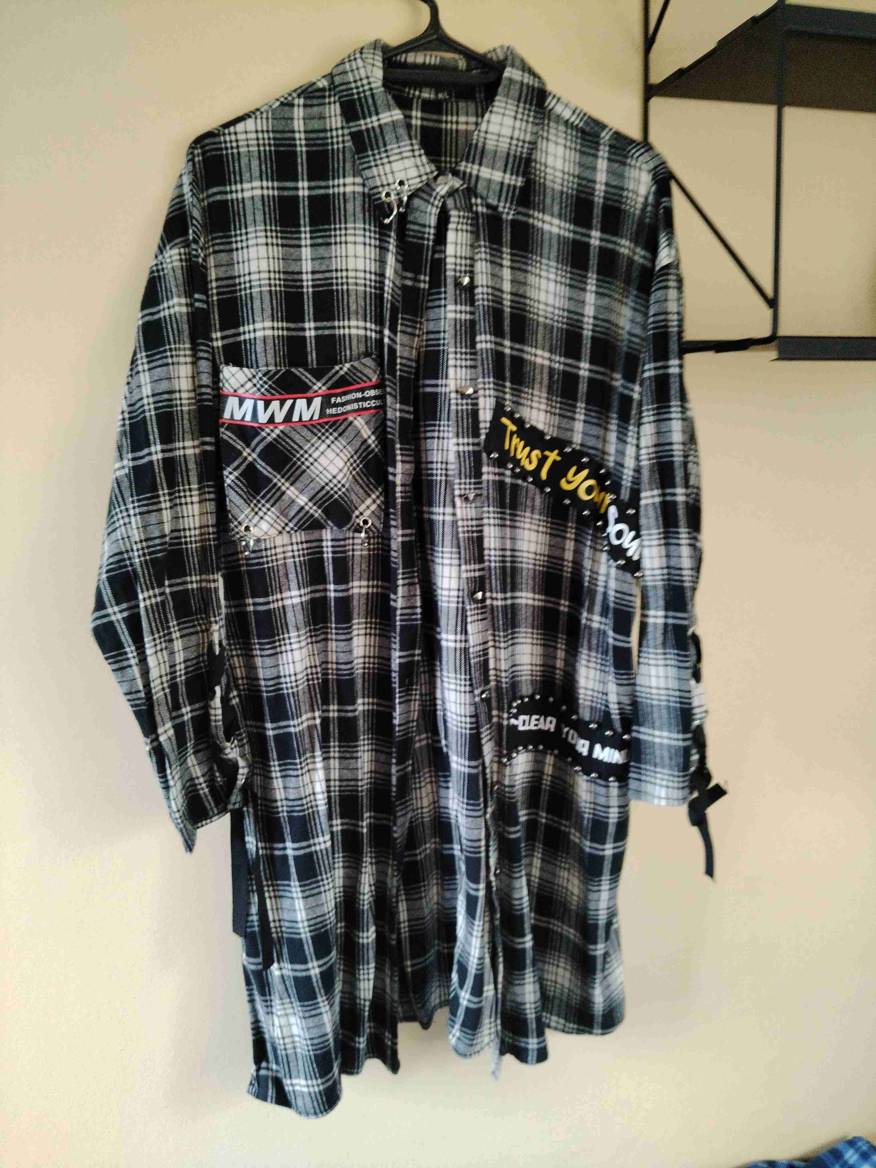 Camisa estilo oversize a cuadros en negro y blanco, con detalles gráficos. Perfecta para un look casual y relajado.
