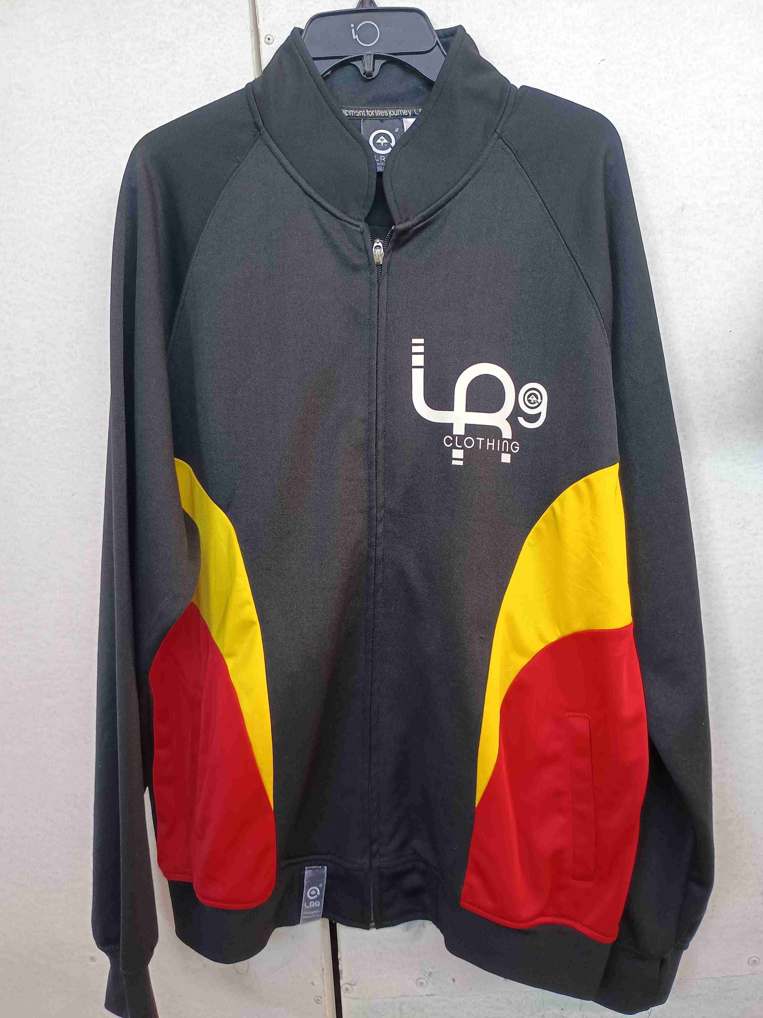 Chaqueta deportiva negra con detalles rojos y amarillos. Ideal para actividades al aire libre. En buen estado general.