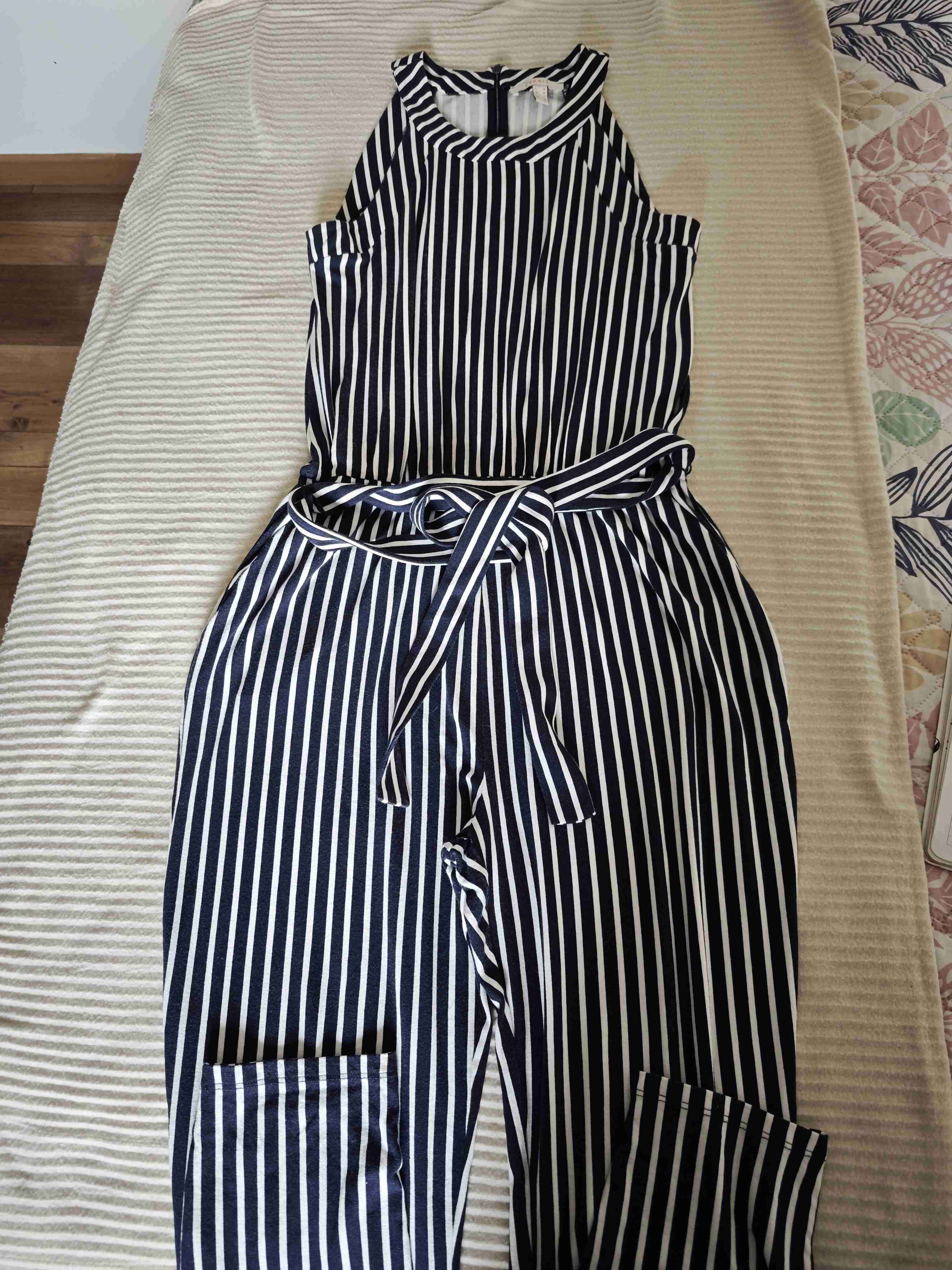 Elegante enterito de rayas verticales en blanco y negro, perfecto para ocasiones casuales o salidas. Sin detalles solo usado en buen estado