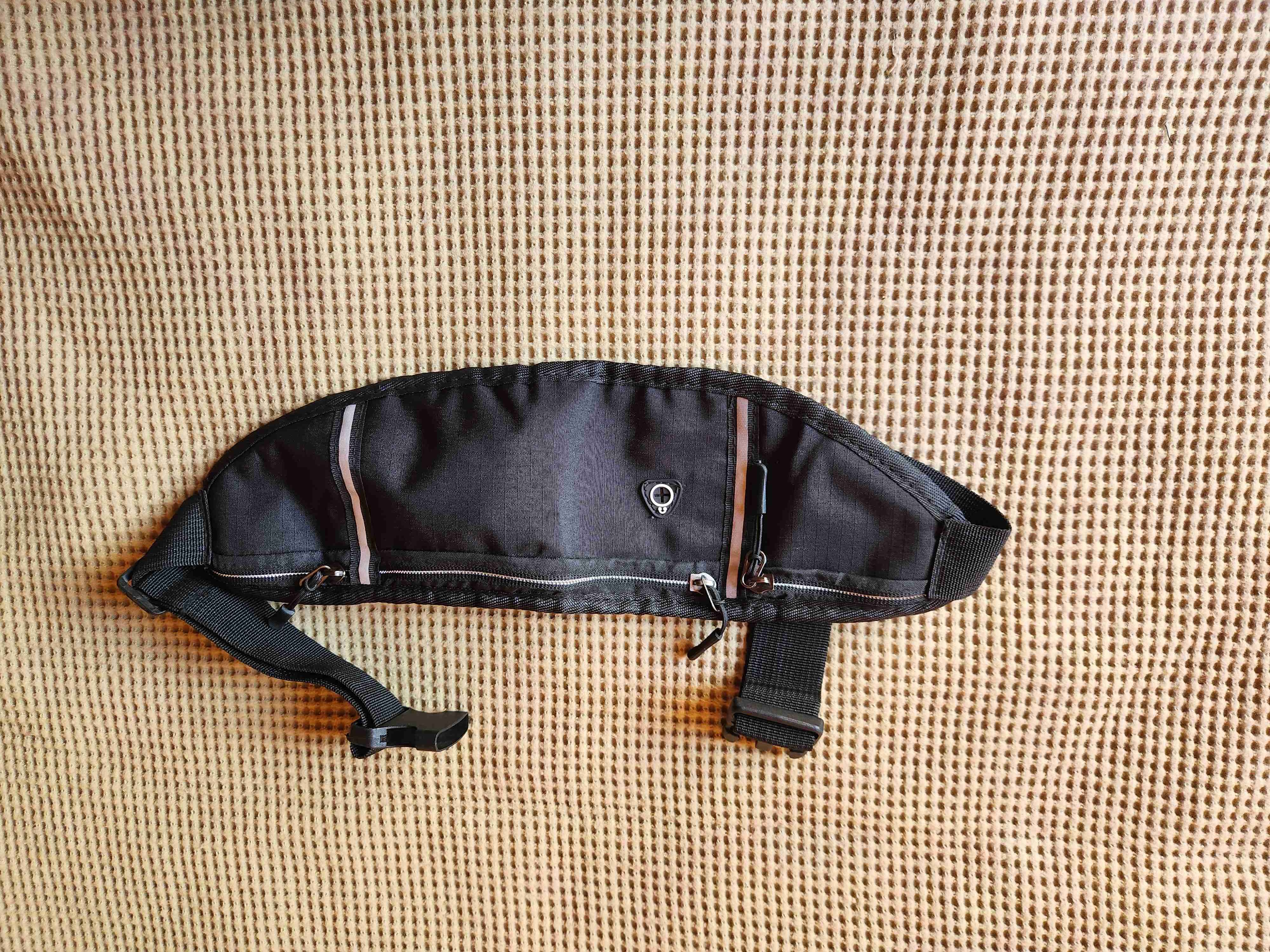 Práctica y cómoda riñonera negra con bolsillos. Ideal para correr o caminar.
