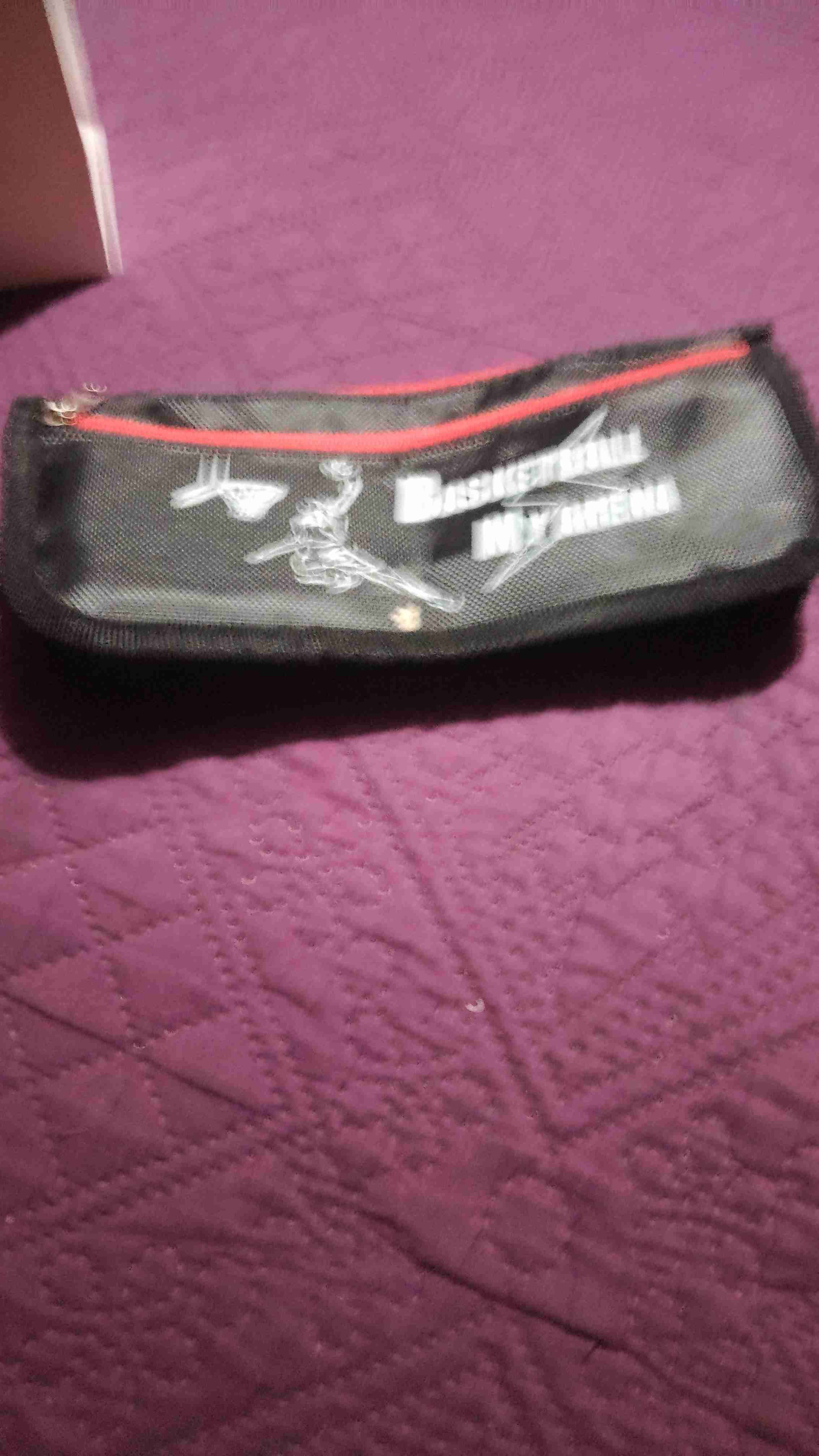 Estuche con diseño de baloncesto. Ideal para lápices y accesorios pequeños. Buen estado, con cierre rojo.