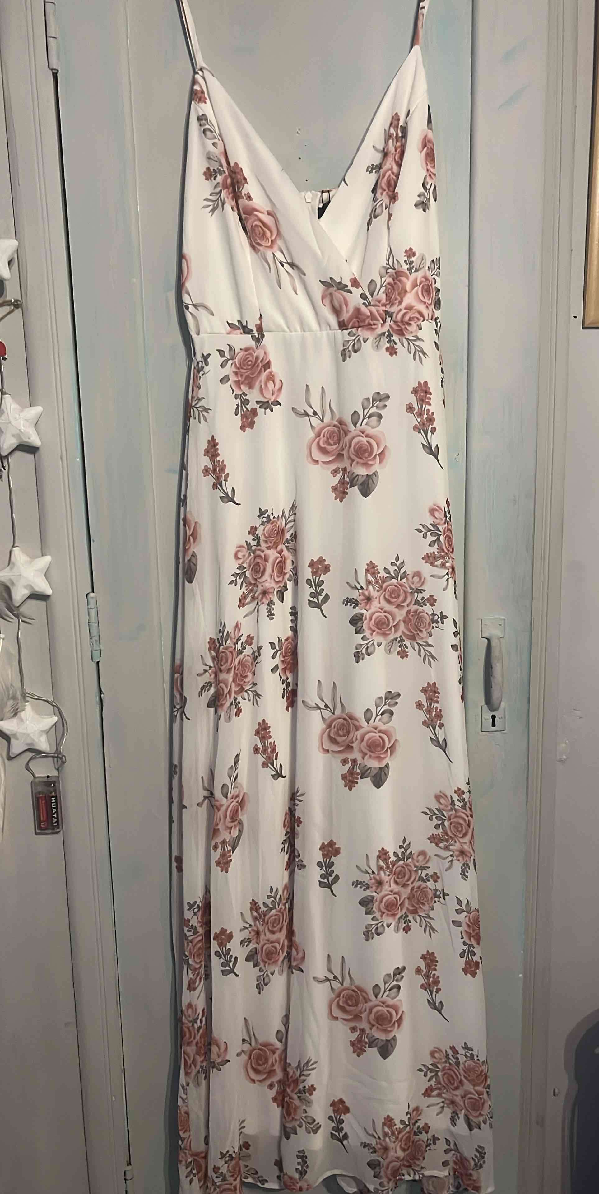 Elegante vestido largo blanco con estampado floral rosado. Perfecto para ocasiones especiales. En buen estado.
