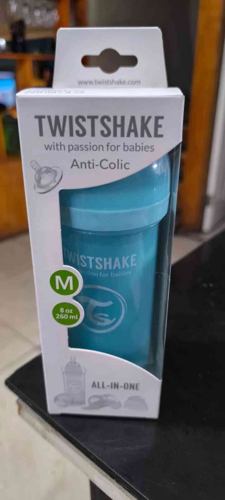 Mamadera azul anti-cólicos de Twistshake, ideal para bebés. Diseño ergonómico y moderno. Nuevo en caja original.