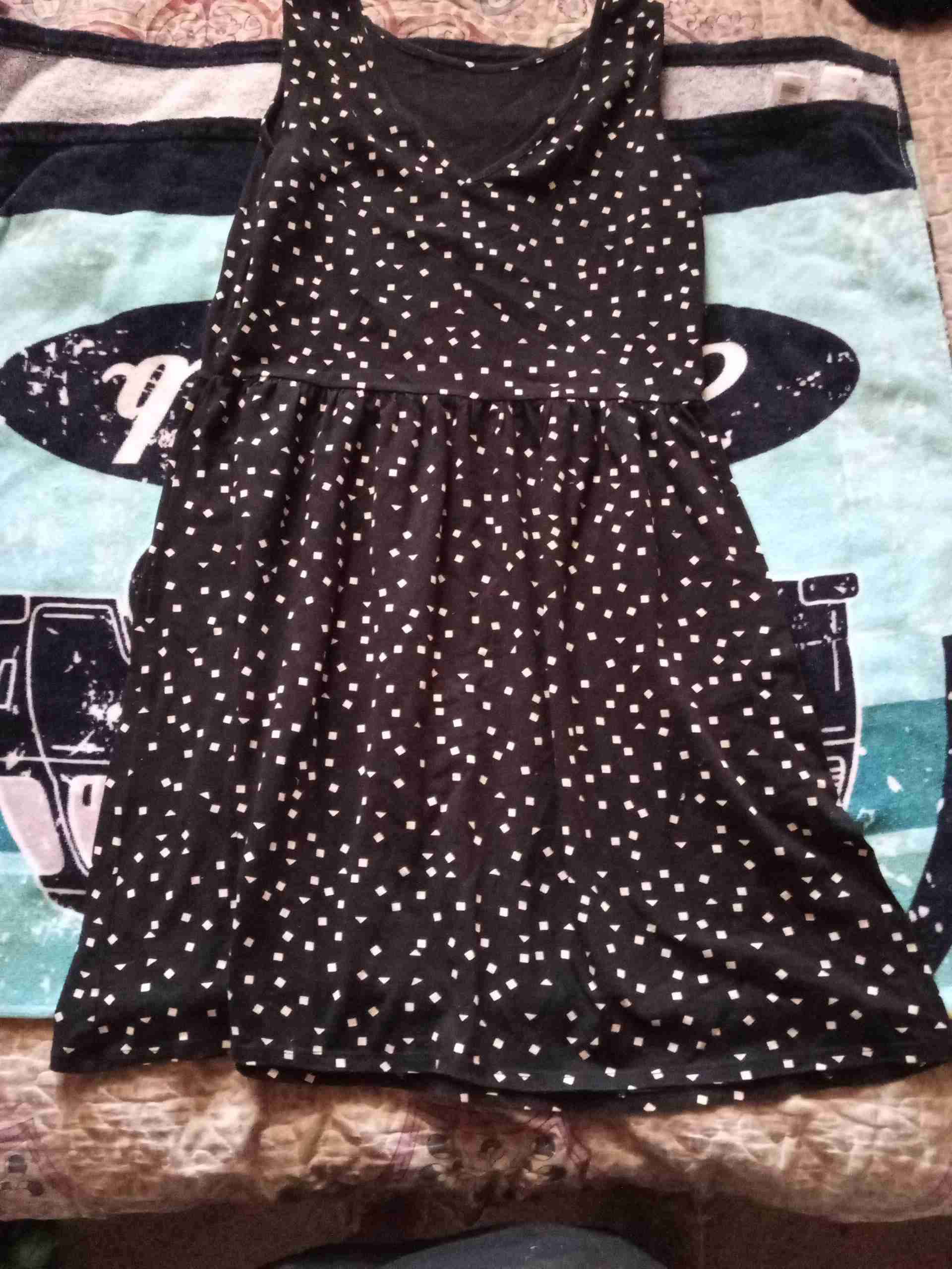 Vestido negro sin mangas con estampado geométrico, ideal para uso diario. En buen estado general.