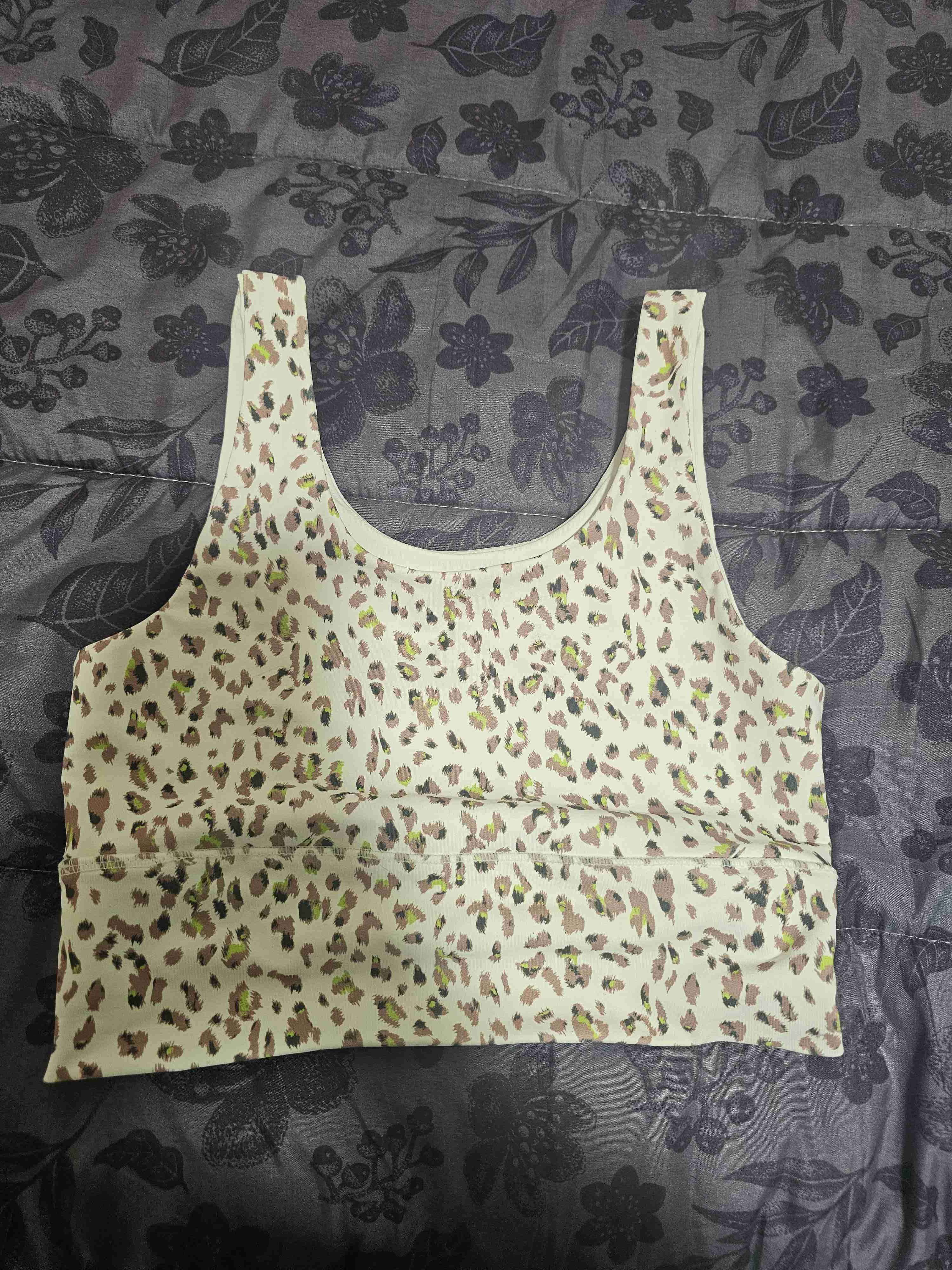 Top deportivo en buen estado con estampado de leopardo, ideal para entrenamientos o uso casual, talla s
