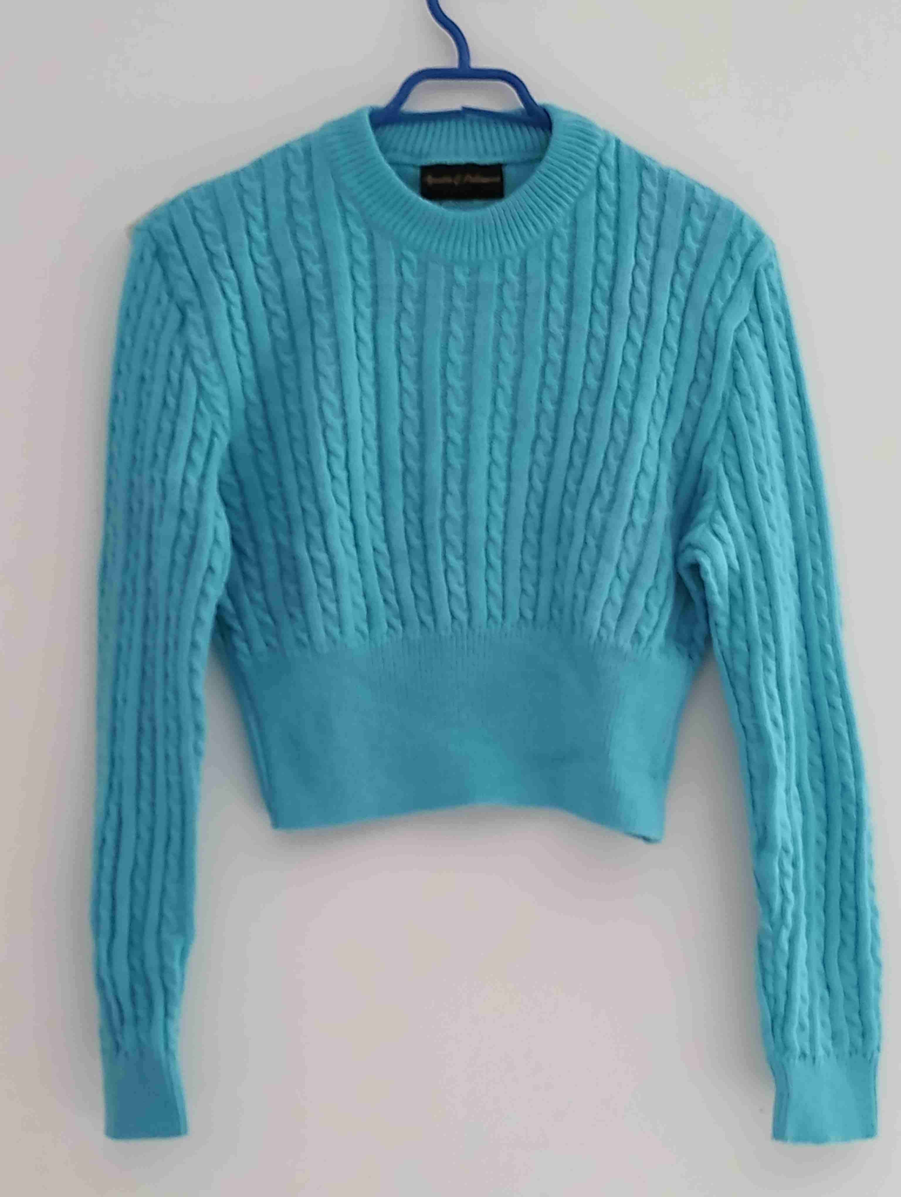 Suéter celeste con diseño trenzado, ideal para el invierno. En buen estado, suave y cómodo.