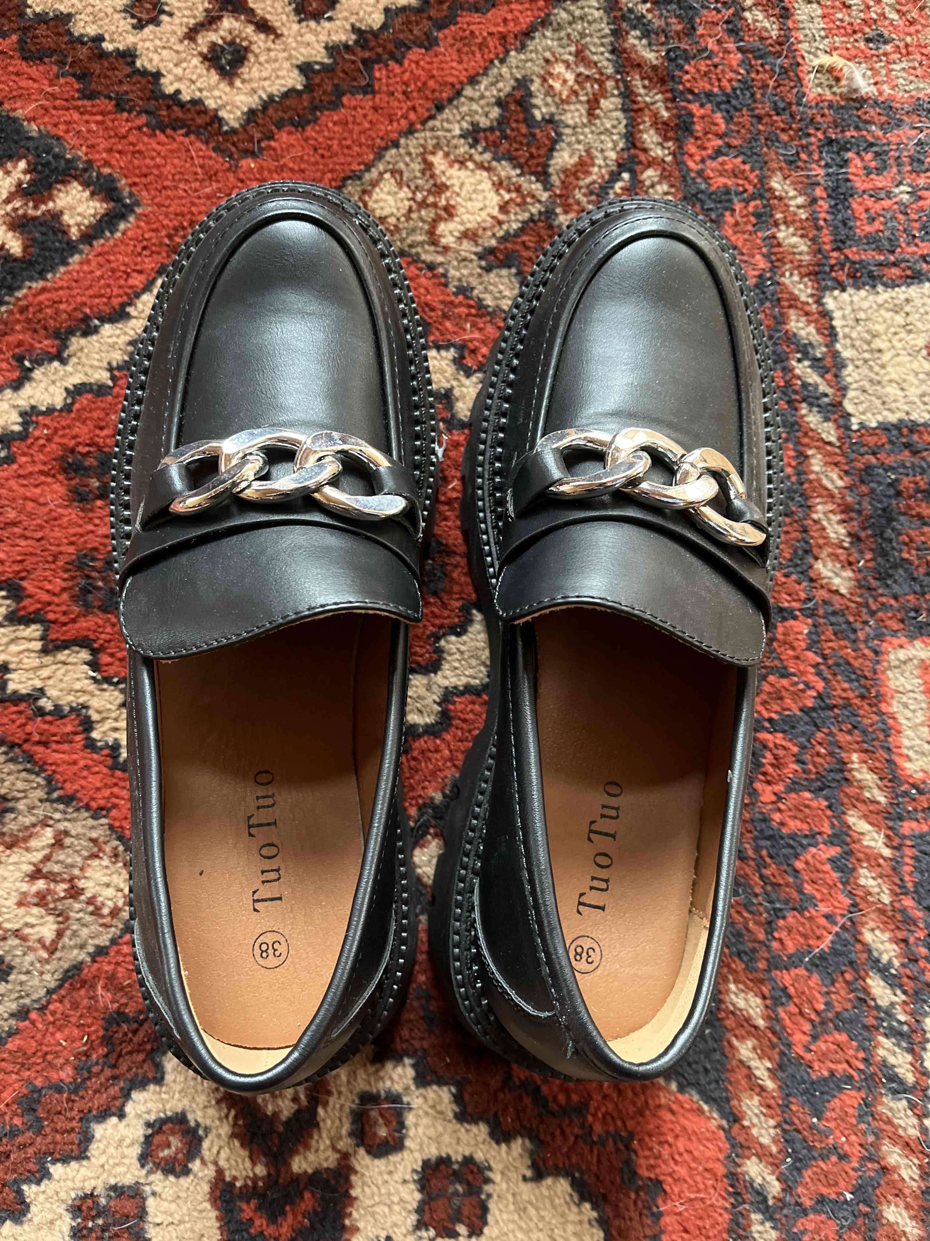 Elegantes mocasines de ecocuero negro con detalle de cadena plateada. En buen estado, perfectos para ocasiones formales o casuales.dice 38 pero son 36