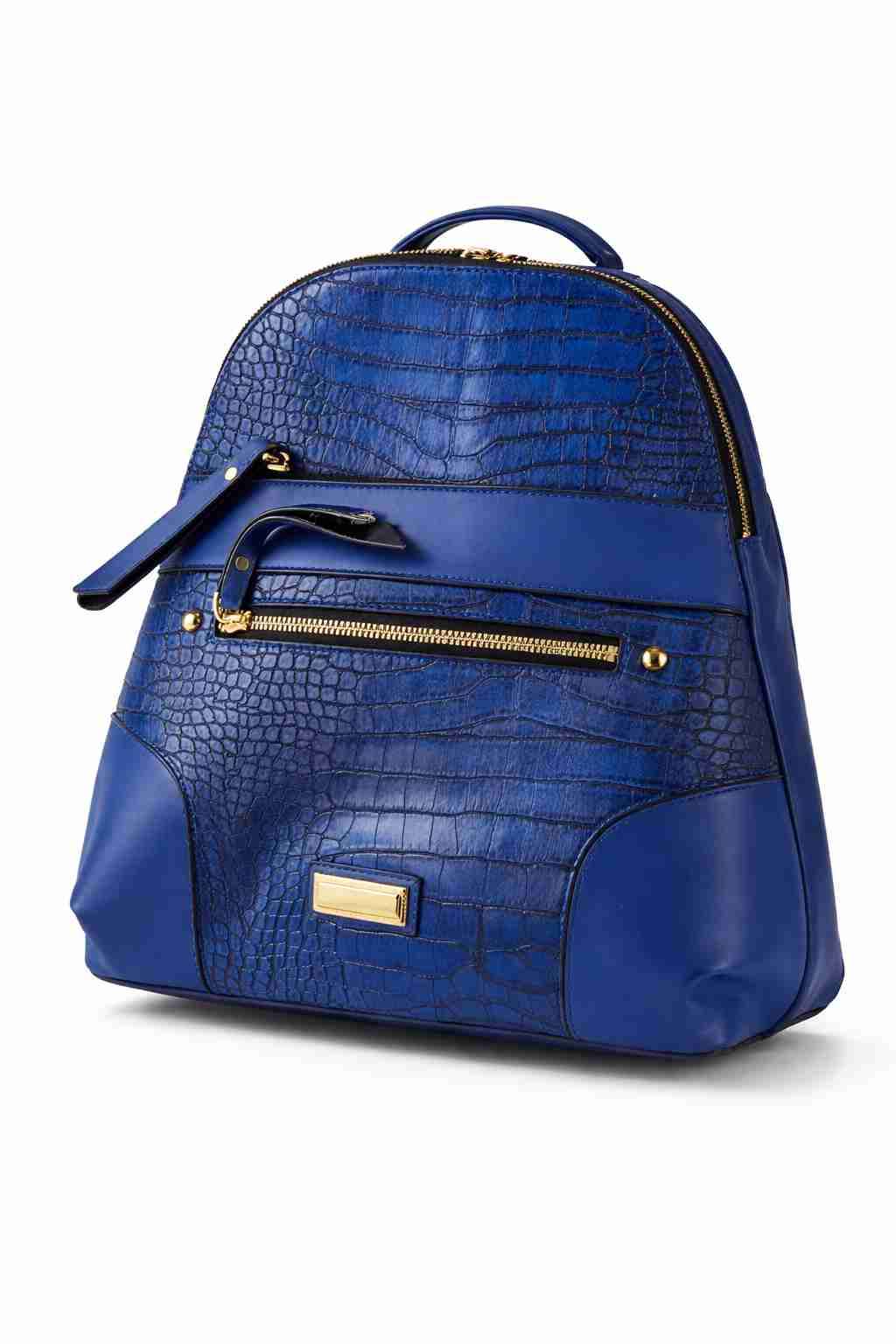 Mochila elegante de color azul con textura de cocodrilo. Ideal para uso diario.