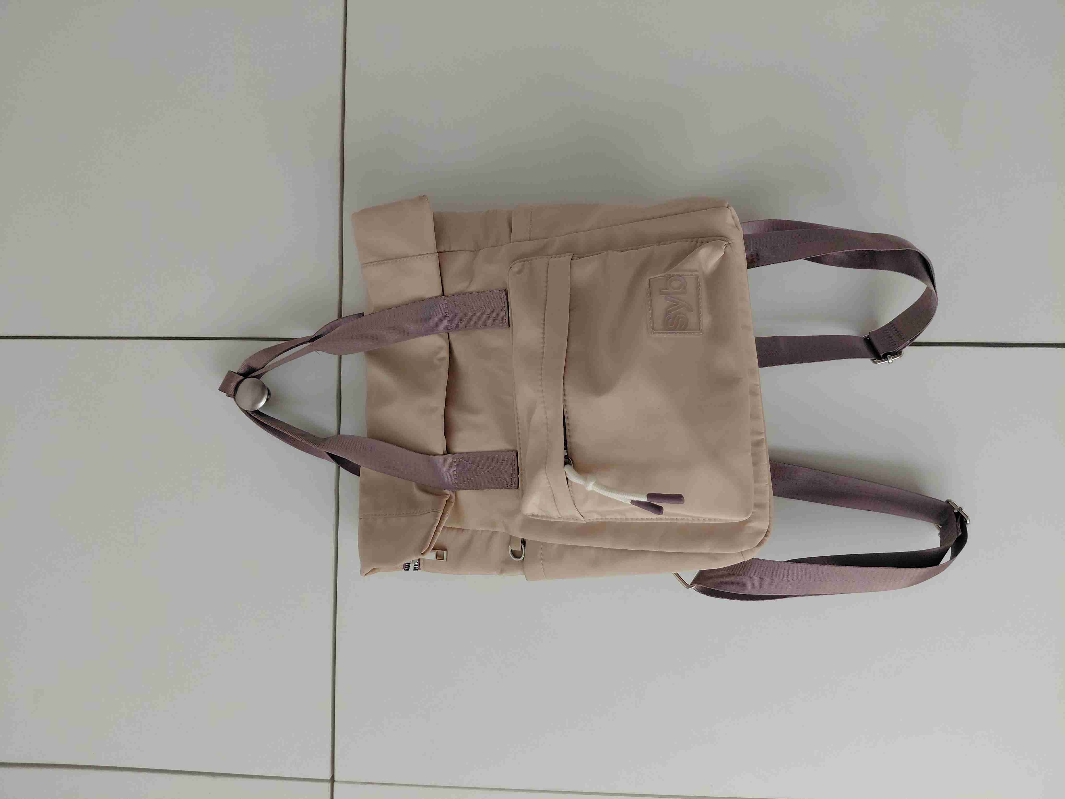 Mochila de color beige y morado, con estilo casual y práctico. Ideal para el día a día. Buen estado, 1 uso. ✨️Tiene para poner 2 botellas Precio conversable.
