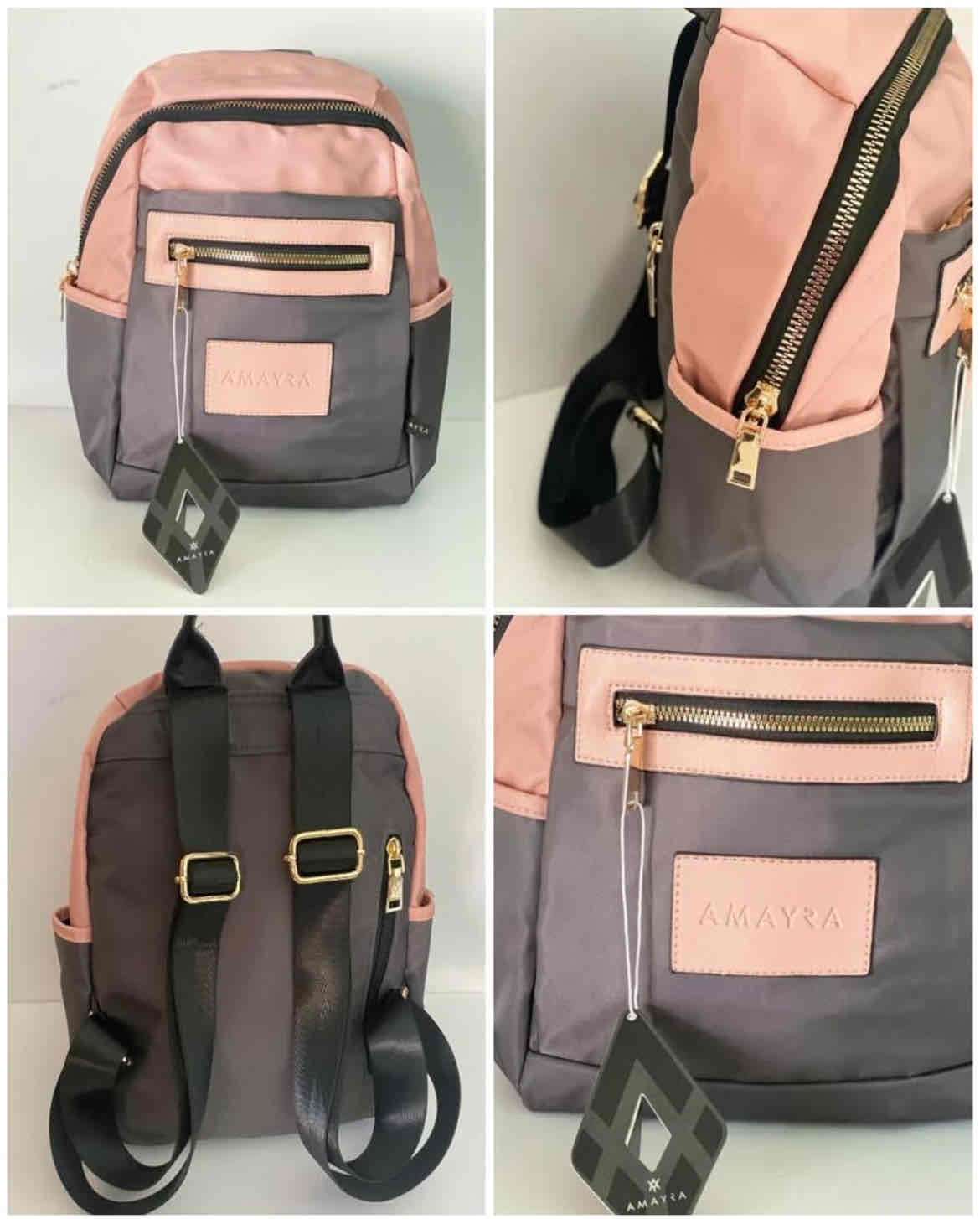 Mochila pequeña Amayra en tonos rosa y gris. Ideal para uso diario con estilo casual y práctico. Nueva con etiqueta.