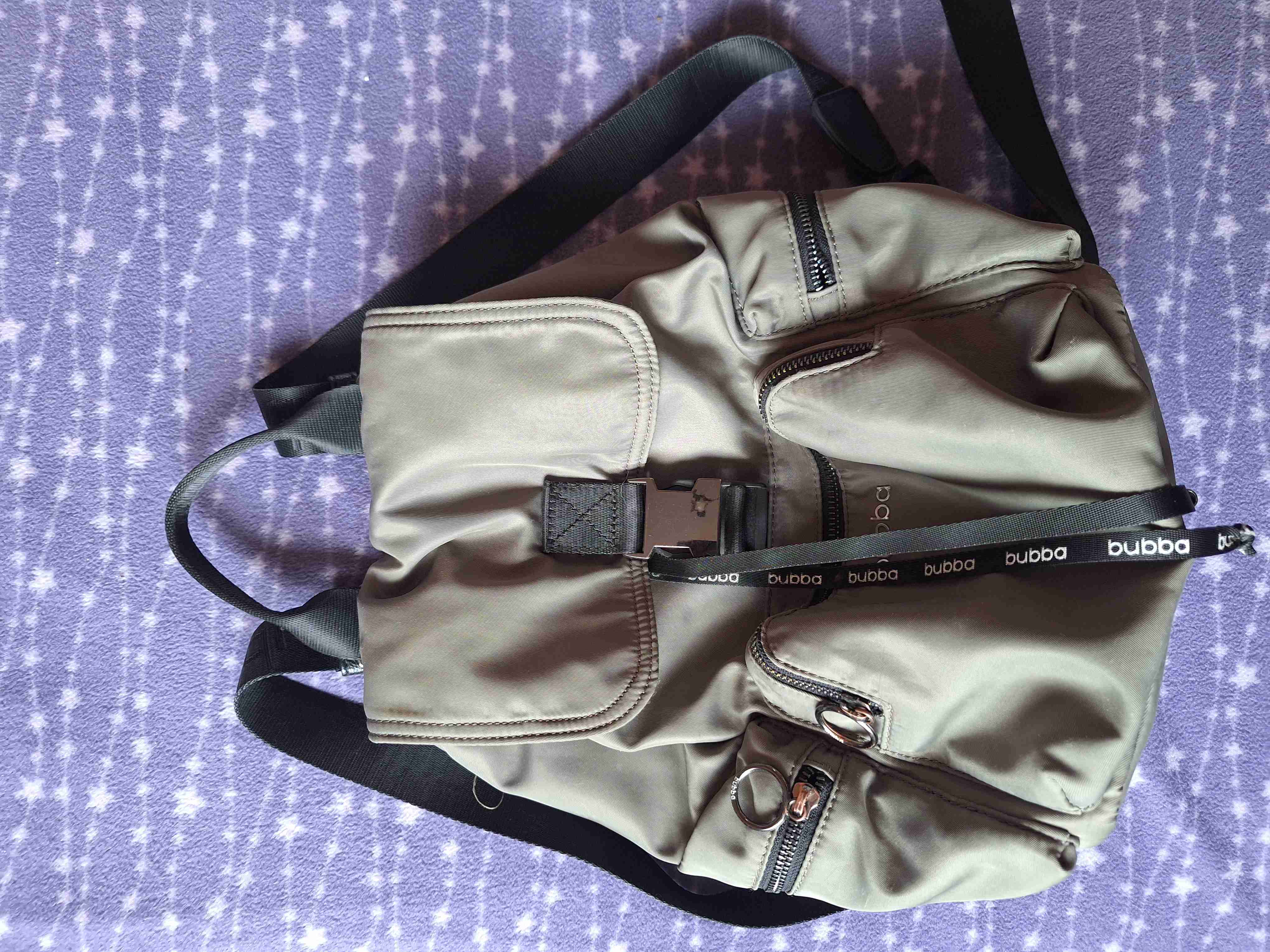 Mochila Bubba verde ideal para el uso diario, con prácticos bolsillos frontales y laterales. En buen estado general.