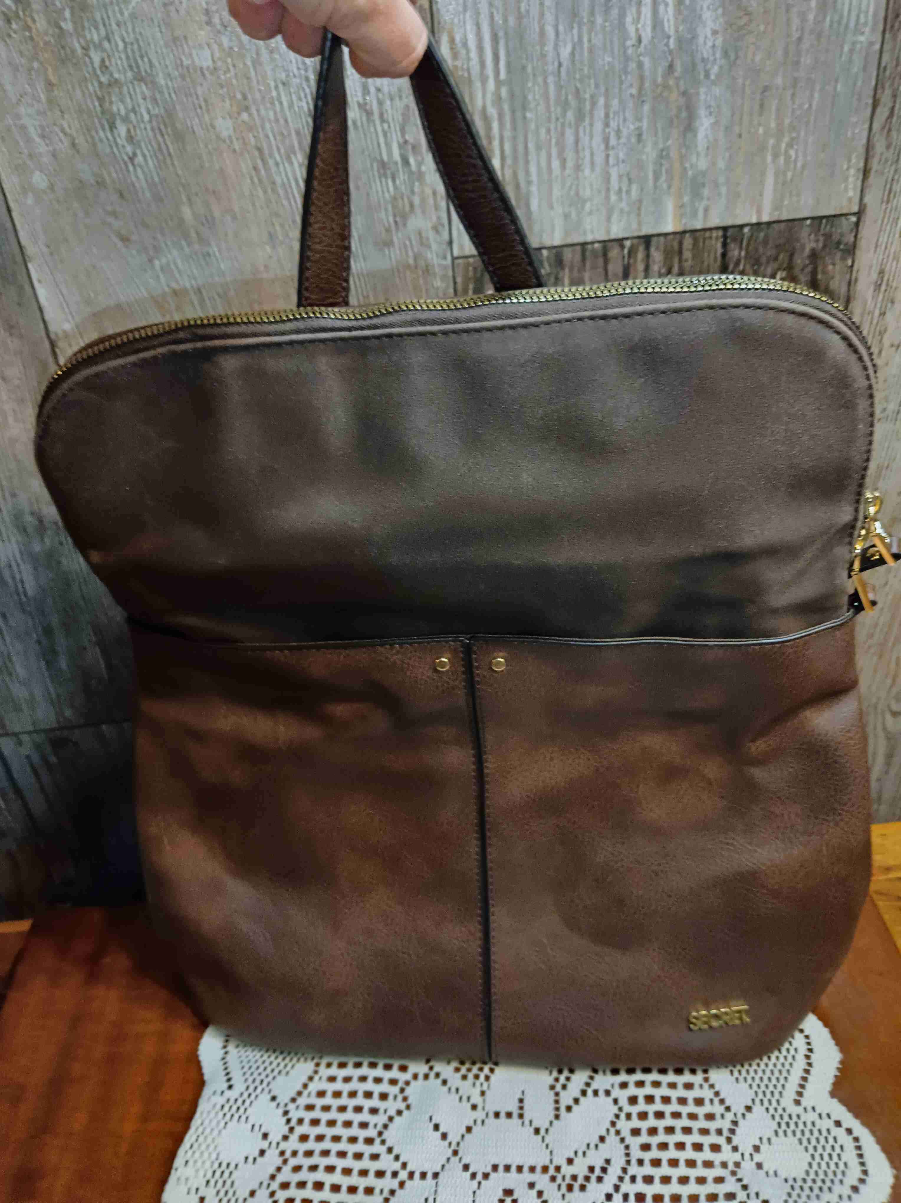 Ideal para llevar documentos o portátil. Asa resistente para usar en la mano o al hombro y también posee un cierre dorado robusto. Color café, lista para una segunda vida. ¿Mochila o cartera? Las Dos