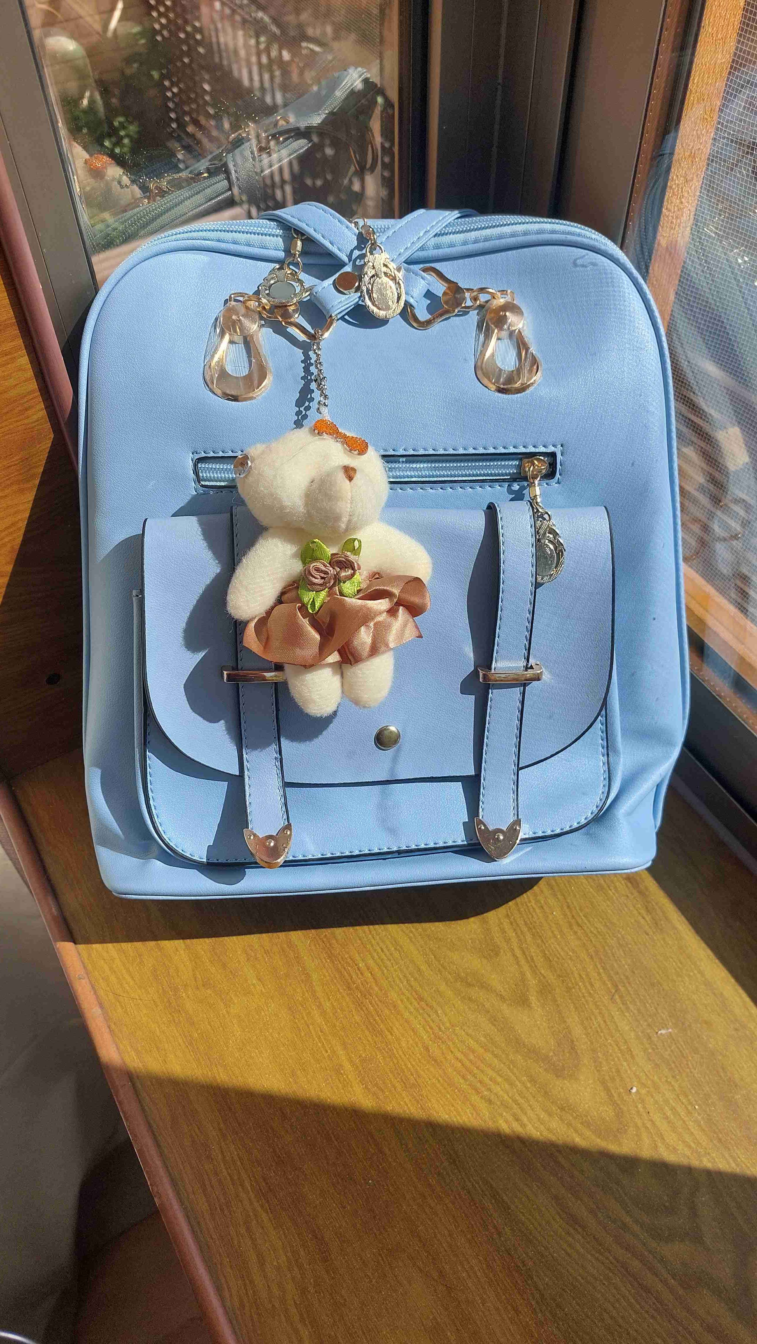 Linda y adorable mochila celestecon detalles dorados y llavero de osito. Es ideal para salidas casuales diarias, tanto por su tamaño como su estilo. Está completamente nueva.