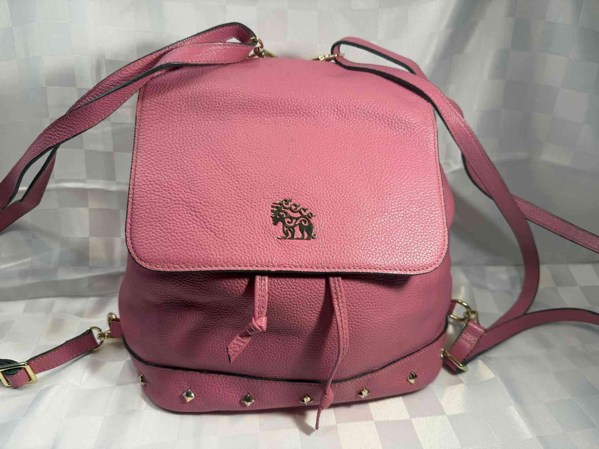 Mochila elegante de cuero mongol rosado, ideal para uso diario. En buen estado con detalles metálicos decorativos.